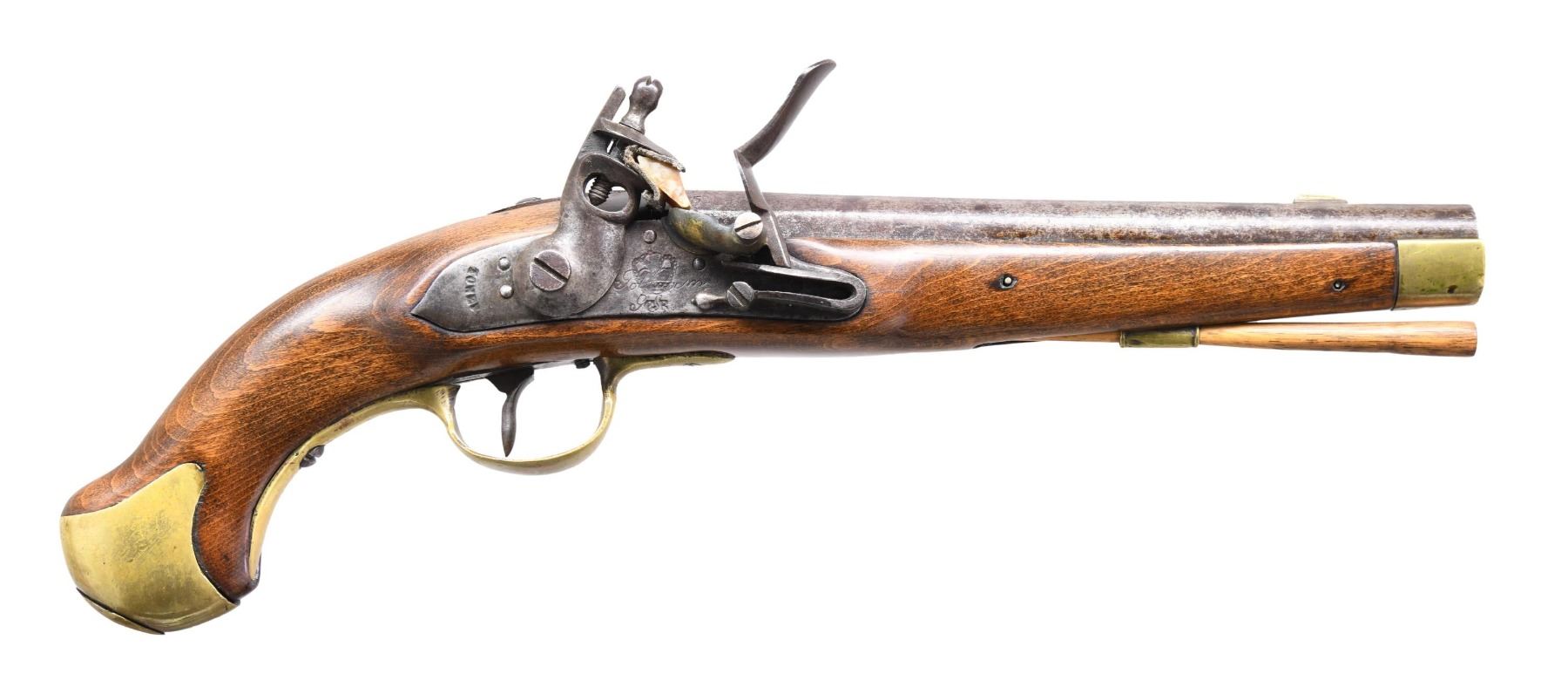 FLINTLOCK DRAGOON PISTOL. Cal. 64. S# NSN. During the mid 18th Century many surplus European firearms were over stamped with Tower markings to realize a higher profit. This Potsdam dragoon pistol has 9-1/2" tapered round barrel with Prussian proofs and regimental markings "1 E 12 LWR" on breech end. Flint lock with inset brass pan and reinforced cock is deeply stamped with a crown and "GR" over "Potsdam" markings. Rear of plate is stamped "TOWER". Beechwood stock extends to muzzle with brass cap and is brass mounted. No markings are found. CONDITION: good with refinished stock. Iron parts show light cleaning to speckled dark silver and gray. Brass shows old cleaning and moderate toning. Stock is heavily refinished with rounded details and wood under metal. Dark pitted bore. Mechanically good and complete. (01-25598/MGM). ANTIQUE. $900-1,200.