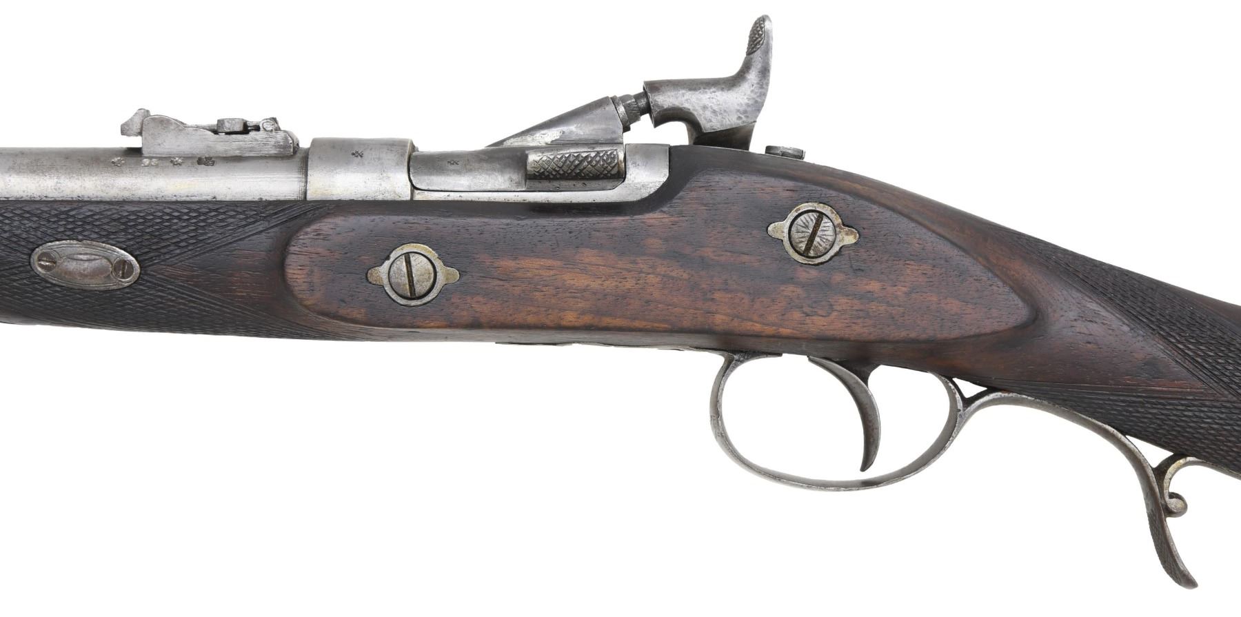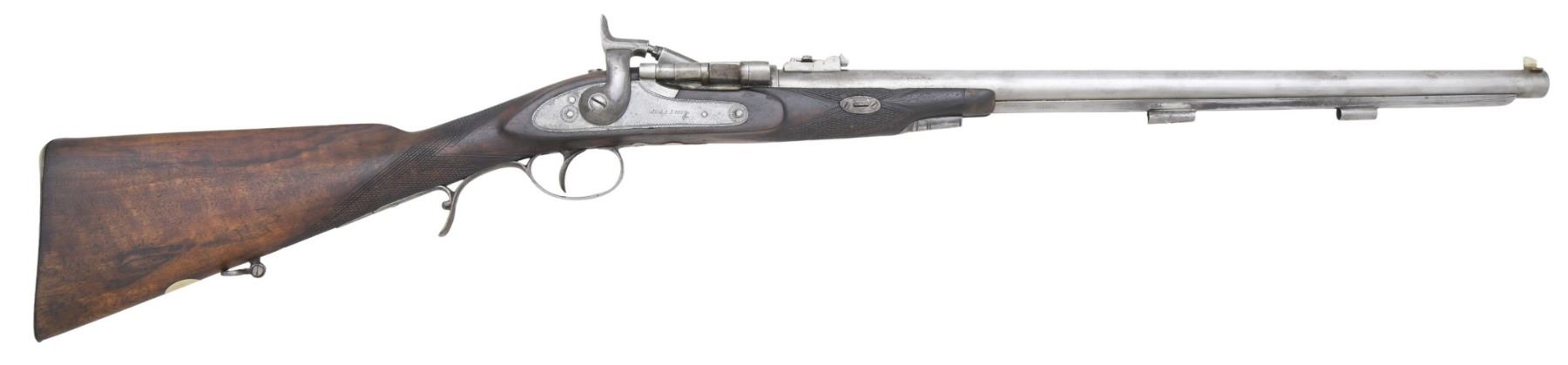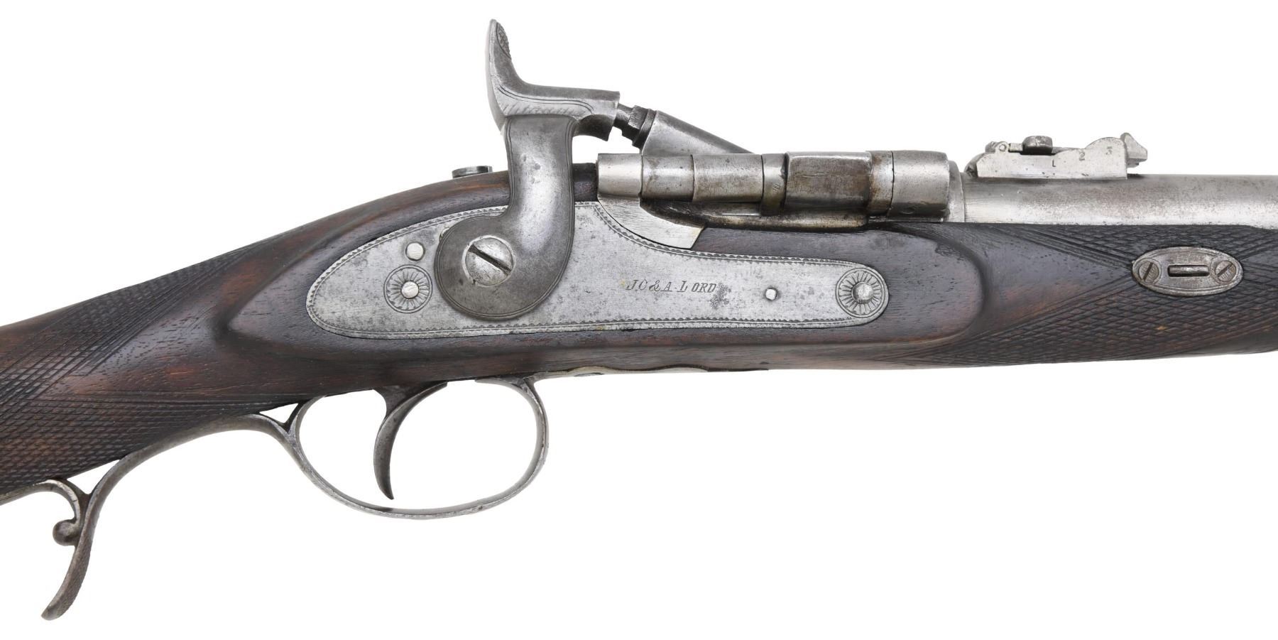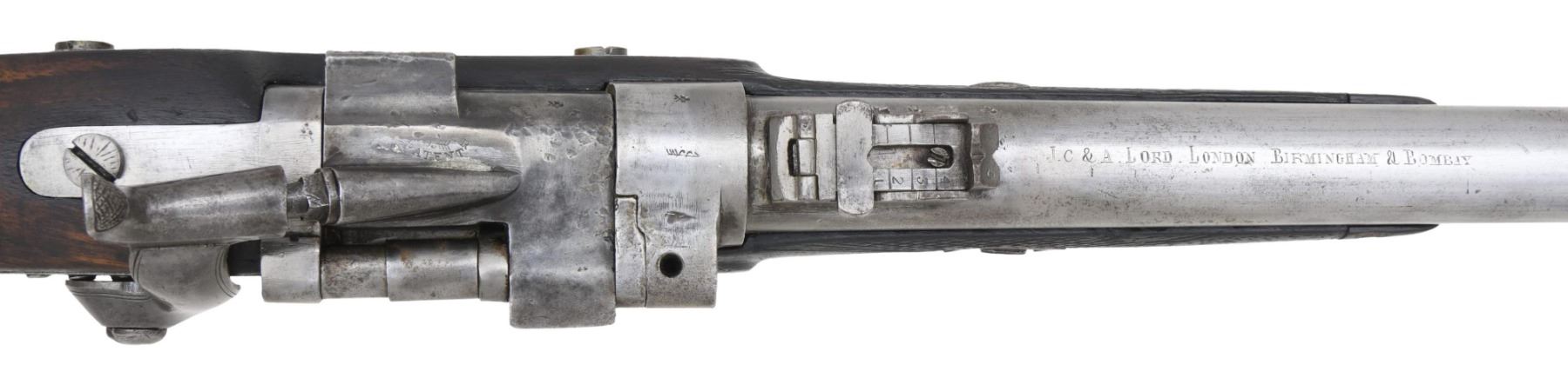 CARTRIDGE CONVERSION CARBINE. Cal. 577 Snider. NSN. Bbl. 21 1/2". Breechloading Snider Patent cartridge conversion carbine. top of the rnd. bbl. is engraved "J.C. & A. LORD. LONDON BIRMINGHAM & BOMBAY, with British proofs marked on the left towards the breech. Lockplate features decorative border engraving, as well as 2 flower motifs, with "J.C & A. LORD" at the center. Top of breechblock exhibits a faint "SNIDER/ ("S" INTERTWINED WITH ARROW)/ PATNET", with an faint "S" intertwined with an arrow also marked over the chamber. Metal components have been cleaned at one time, and are in-the-white. Checkered wood straight grip half-stock, with horn tipped forearm, and 3 iron ramrod ferrules. Contemporary blade front sight, with standard V-notch rear sight, graduated 1-4. Ramrod is absent. CONDITION: metal components have been cleaned and are in-the-white, exhibiting scattered spots of light pitting, as well as areas of age related discoloration overall. Center ramrod ferrule exhibits a hole at the center. Left side of breechblock exhibits what appears to be a small welded section right at the edge of the firing pin ramp. Very bright bore, exhibiting scattered areas of pitting, while retaining strong rifling throughout. Wood stock appears to have been lightly sanded and reoiled, exhibiting scattered marks, some minor impressions, as well as a few chips from handling and storage, with a crack stemming from the horn tip on the left side of the forearm. (01-26003/MLW). ANTIQUE. $300-400.