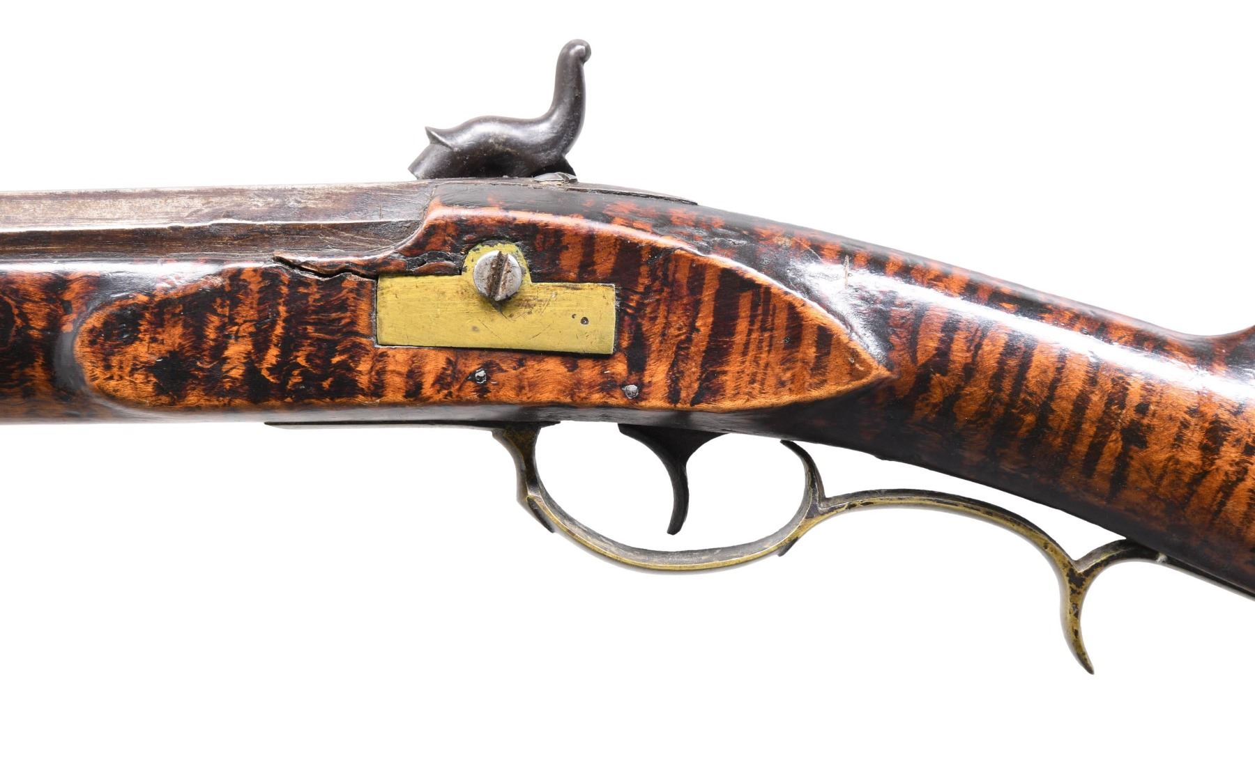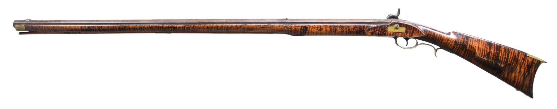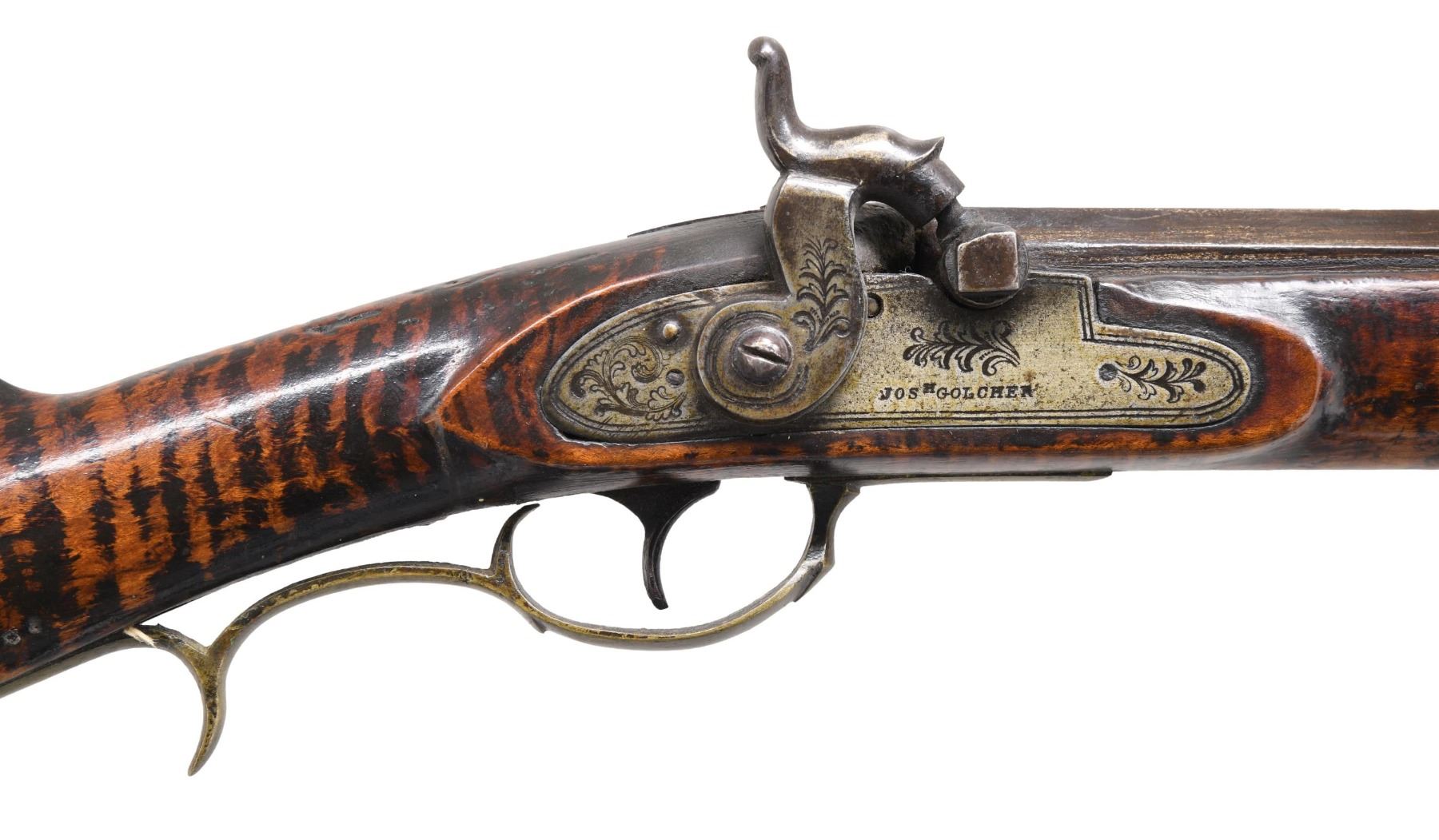 WITH GOLCHER LOCK. Cal. 35. S# NSN. The 36-1/4" full octagon barrel fitted with "U" notch rear and German silver blade front sights is unmarked. Percussion system is drum and nipple. Front spring lock has not been altered and is fitted with flat faced percussion hammer. "JOSh GOLCHER" is stamped at center of plate surrounded by double line borders and stamped in scrolls. Trigger is not set. Attractive fullstock of curly maple that has had burned in enhancement extends to muzzle with brass cap. Stock is pinned to barrel and features classic Roman nose comb and small moulded cheekpiece. Stock is brass mounted and features a simple rectangular patchbox on right side with arched top and inlet side panels. Release button is in 3" return of small crescent buttplate. Trigger guard with squared finials has finger spur. Sideplate is also rectangular. Plain hickory ramrod mounts through two double beaded pipes and matching thimble. CONDITION: good to very good. Iron parts showing old light cleaning with silver highlights to smooth brown barrel and silver gray lock. Brass is nicely toned. Stock retains most of its original finish with some oil added and exhibits hand worn patina at balance point. A 1" stress crack is noted above sideplate otherwise stock is structurally sound. Bore is good with strong rifling, pitted throughout. Lock is good. (01-25590/MGM). ANTIQUE. $1,000-1,500.