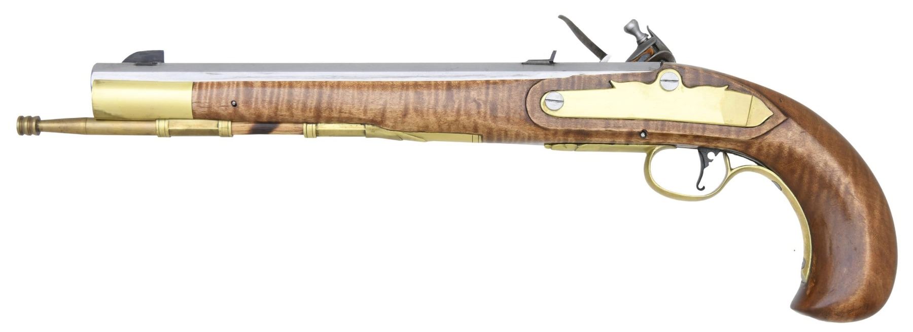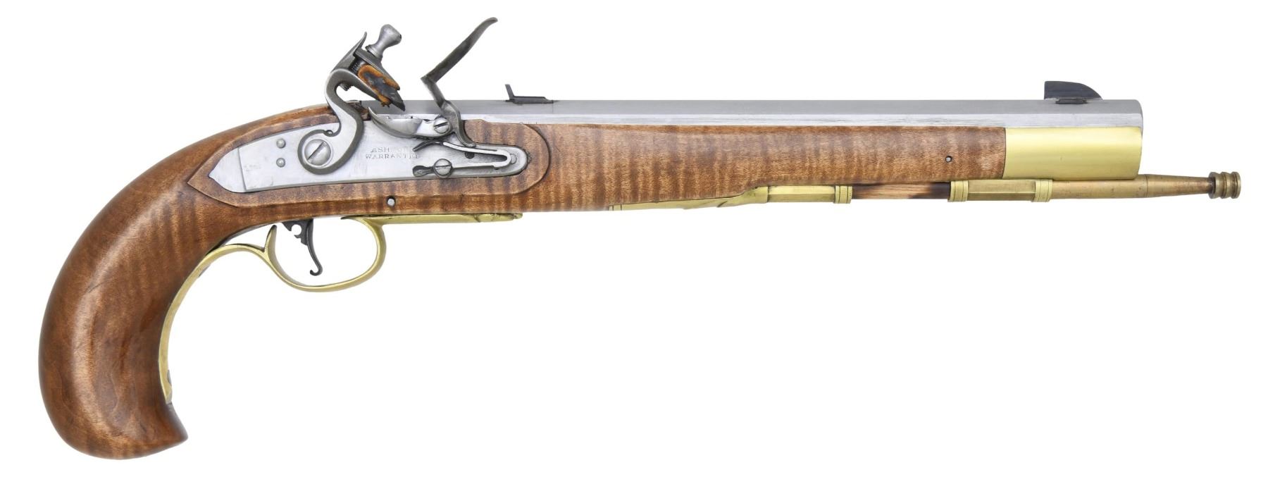 Cal. 45. NSN. Bbl. 11.5". Octagonal barrel with blade front sight and notch rear sight. Ashmore Warranted-marked lock. Maple stock with brass fittings. Hardwood ramrod. CONDITION: lock shows heavy cleaning. Balance of the pistol has a very good appearance. Near excellent bore. (01-25981/MD). ANTIQUE. $200-300.