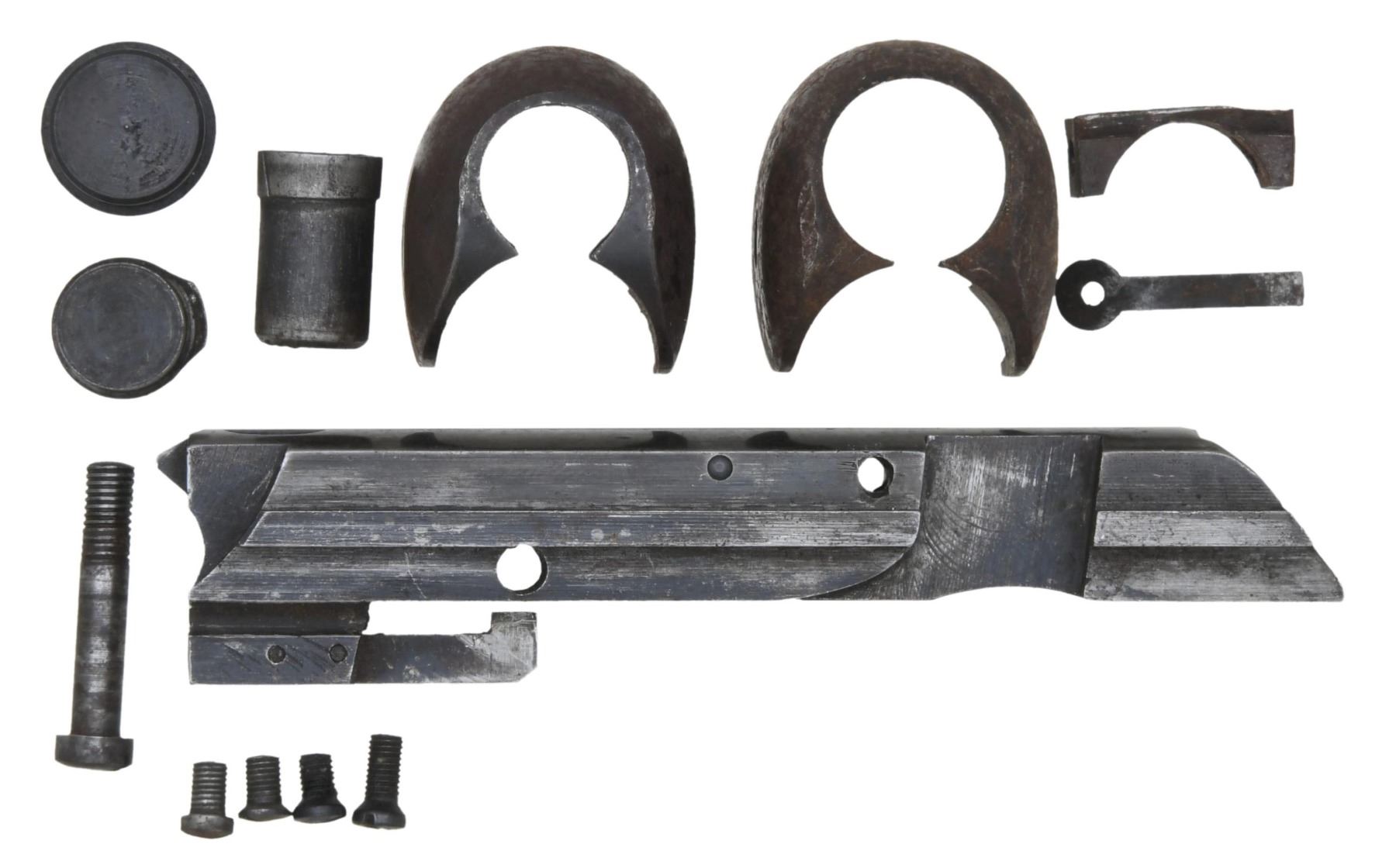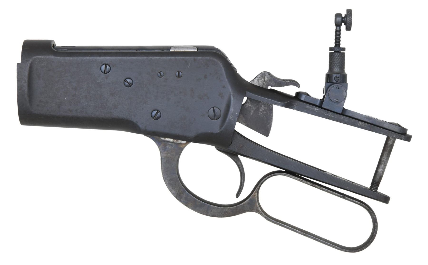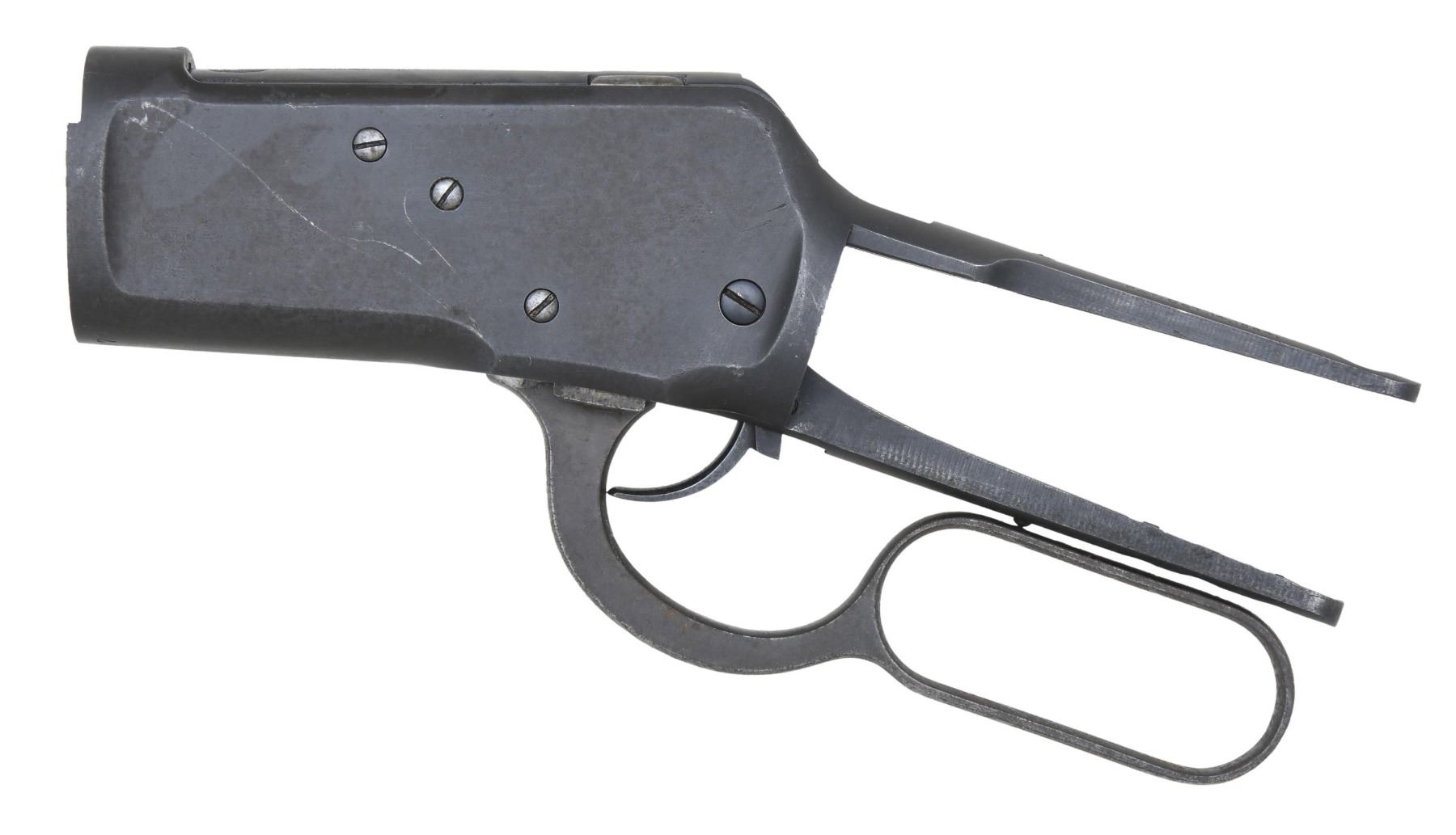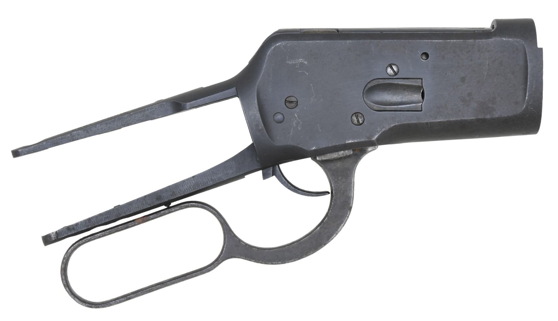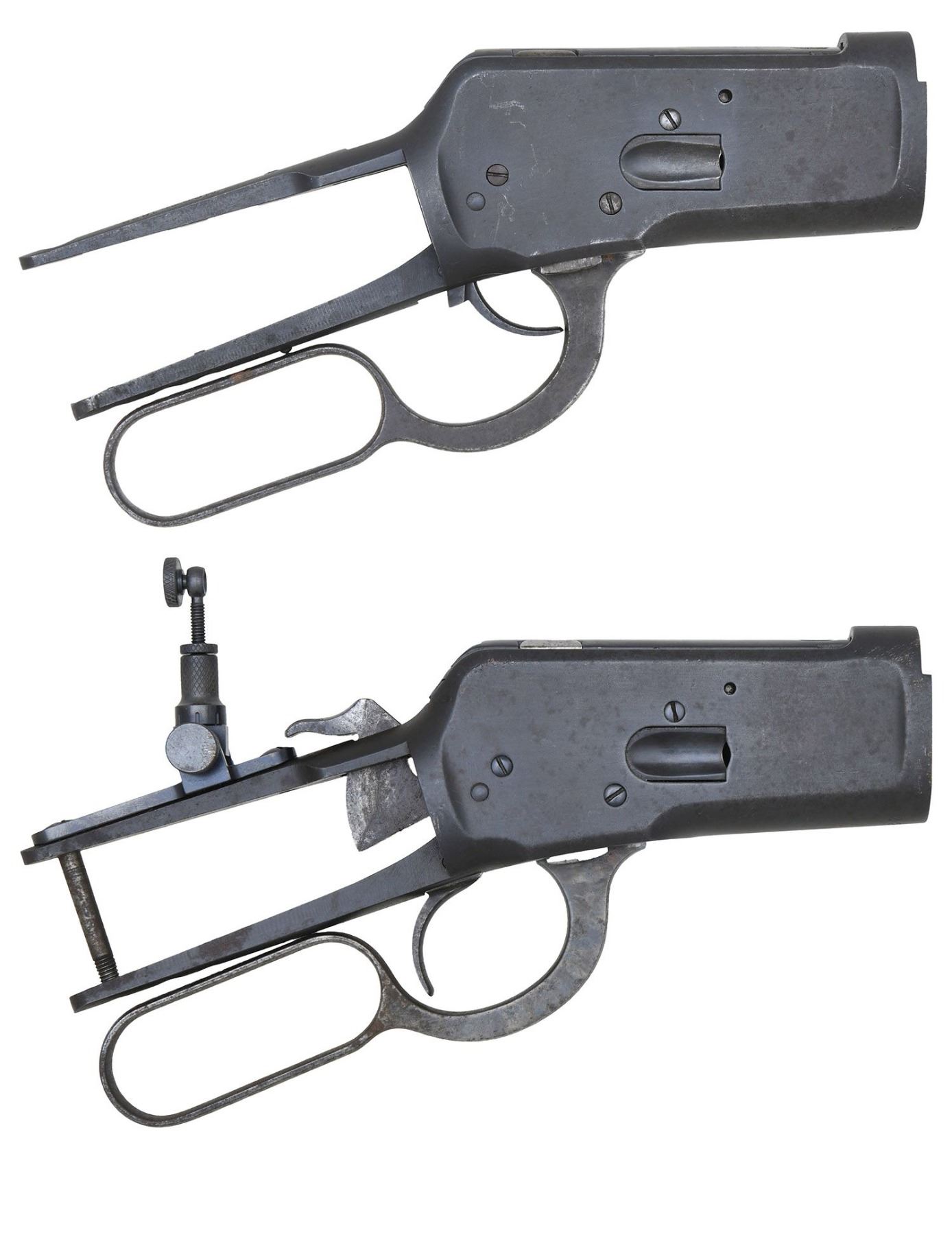 1). S# 9587. Caliber is for 32-20 size case head. Overall dull finish with some missing parts: firing pin, hammer spring, hammer, hammer spring screw and tang screw. Some light scratches on receiver, prior light pitting on lever along with a couple of small oxidation spots. (01-25759/NW). 2). S# 22044. Caliber is for 44-40 size case head. Same dull finish with traces of case colors on lever and hammer. Fitted with like new Marble's reproduction tang sight. Receiver non-factory drilled and tapped for side mount receiver sight. Missing hammer spring plus its attachment screw and strain screw. Light pitting on lever that does not align perfectly parallel with lower tang. MISC. PARTS: forend cap (2) of each size plus tenon (1), hammer screw, small caliber magazine follower, magazine cap (2) for each size and stripped small caliber bolt with extractor. (01-26009/NW). BOTH ANTIQUE. $350-500.