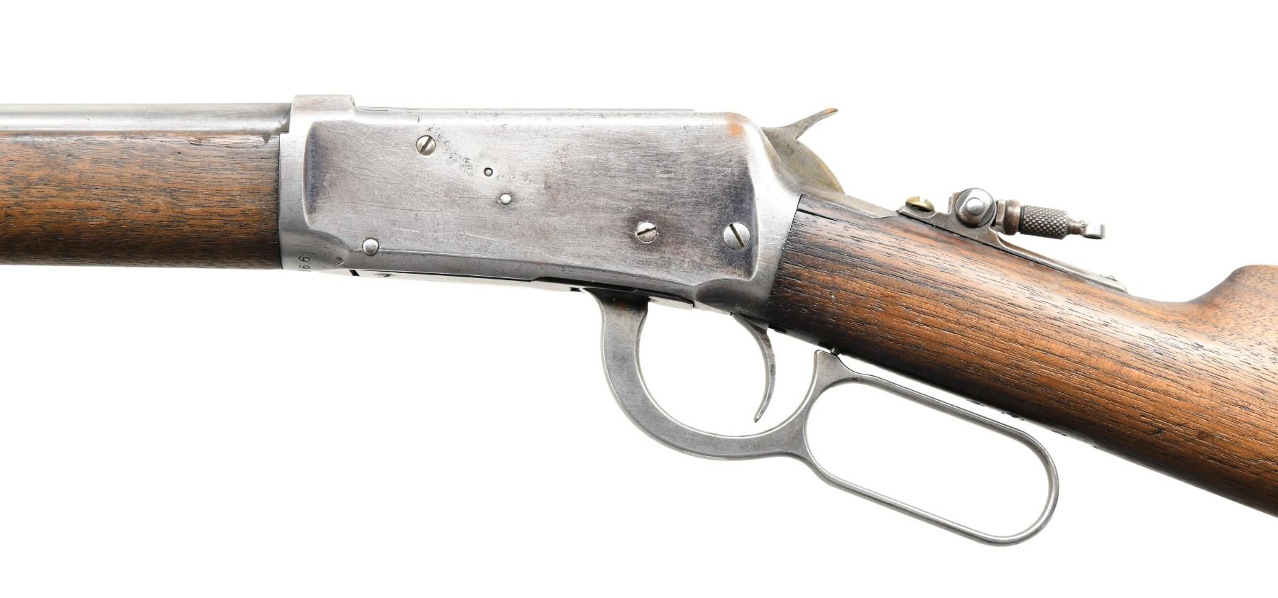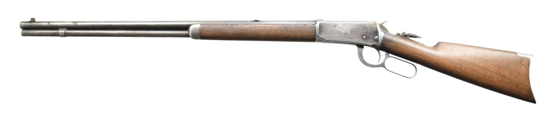 Cal. 30 WCF. S# 36066. Bbl. 26", round. Lyman bead front. Filler in rear dovetail with a combination tang sight. Full-length mag. Walnut forend and straight grip stock with crescent steel buttplate. Mfg. 1895. CONDITION: metal has 20% dull blue fading to gray, showing spots of pitting and surface corrosion. Wood has a worn appearance showing dents and handling marks. Stock has a crack on the left of the top tang. Bore retains strong rifling. (01-25827/DS). ANTIQUE. $800-1,200.