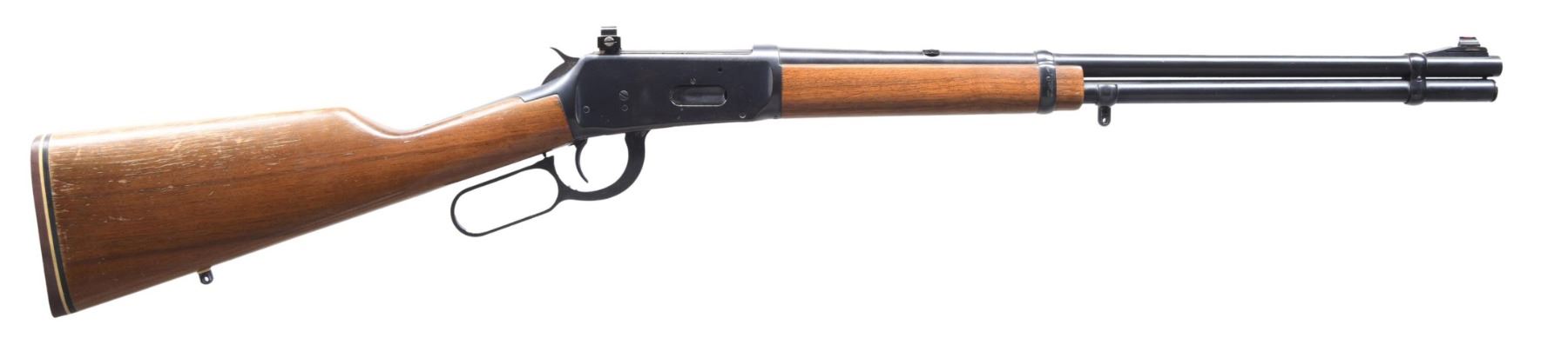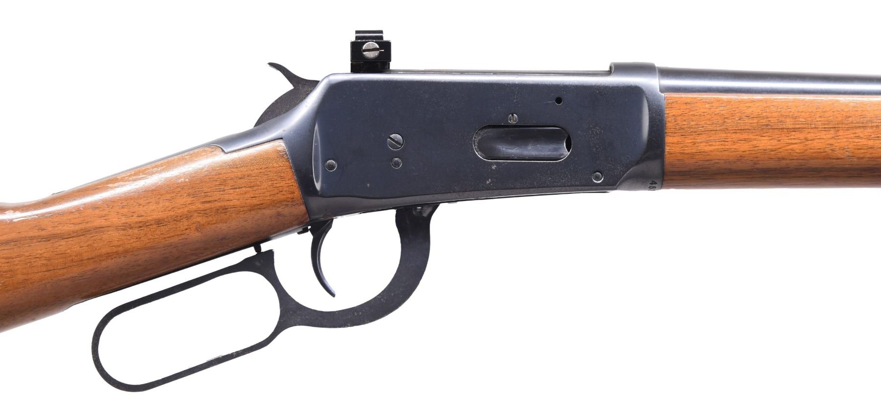 Cal. 30-30 Win. S# 4526059. Bbl. 20". Replacement fiber optic ramp mounted front sight, filler in rear dovetail w/ Williams receiver sight. Tubular mag. Walnut forearm & straight grip stock w/ aftermarket thin brown White Line pad. Aftermarket sling swivels. Mfg. 1977. CONDITION: over 95% original blue. Original wood finish shows wear & areas of peeling finish w/ scattered light marks. Very good bore. (24-4708/DS). CURIO. $300-500.