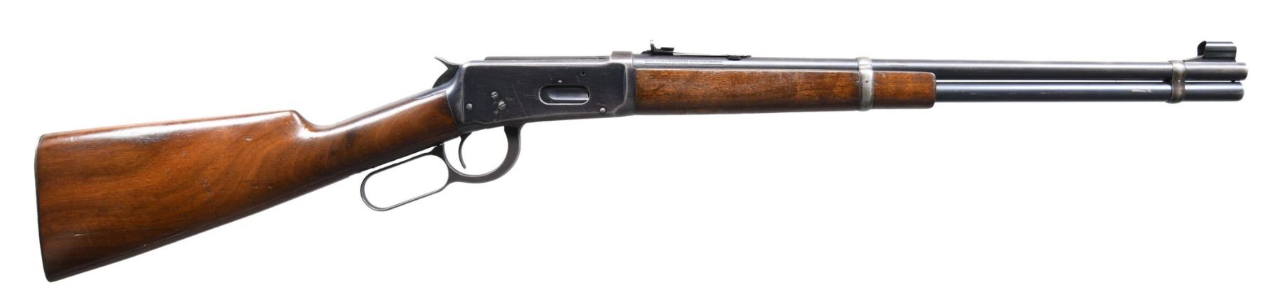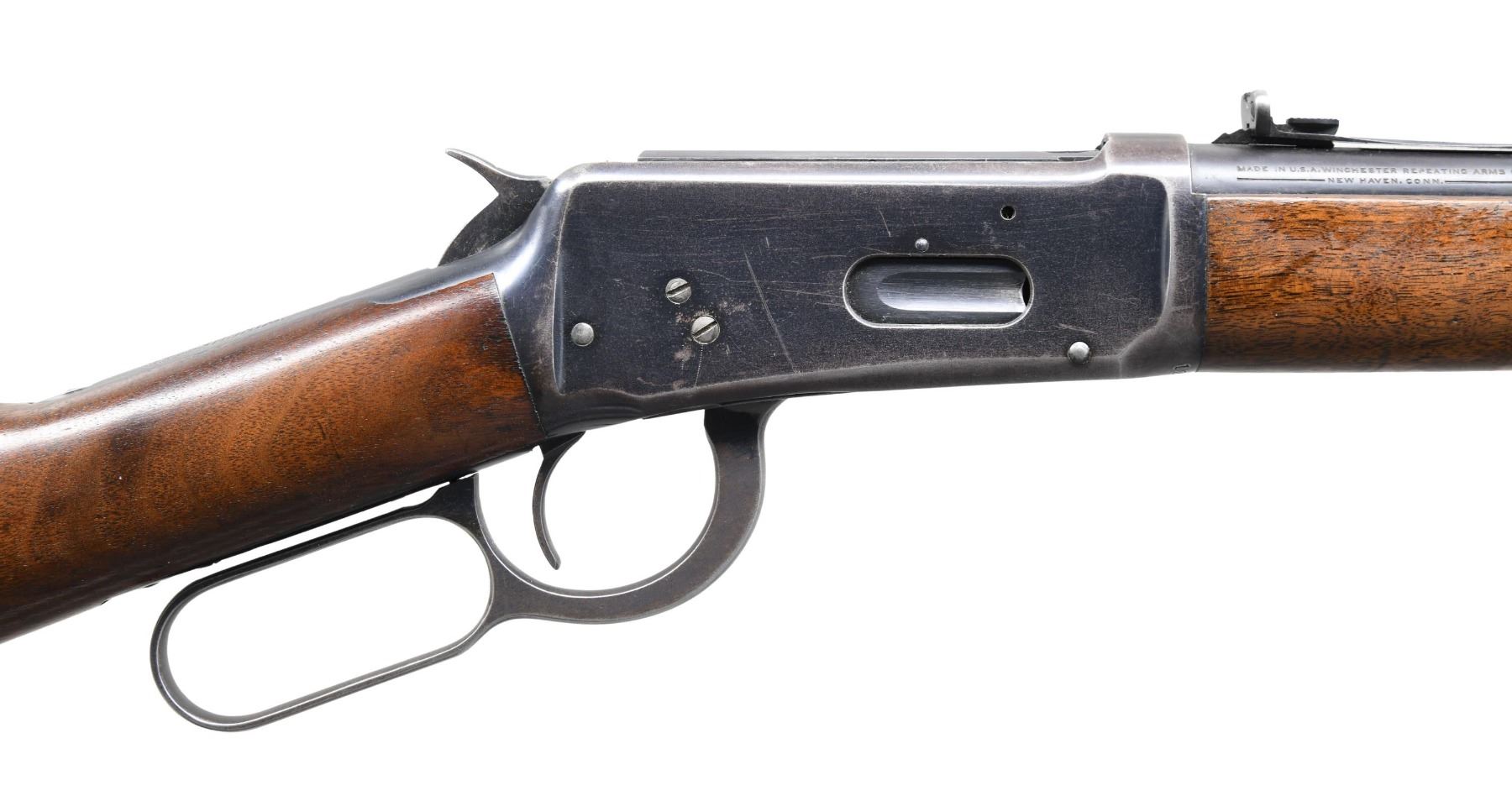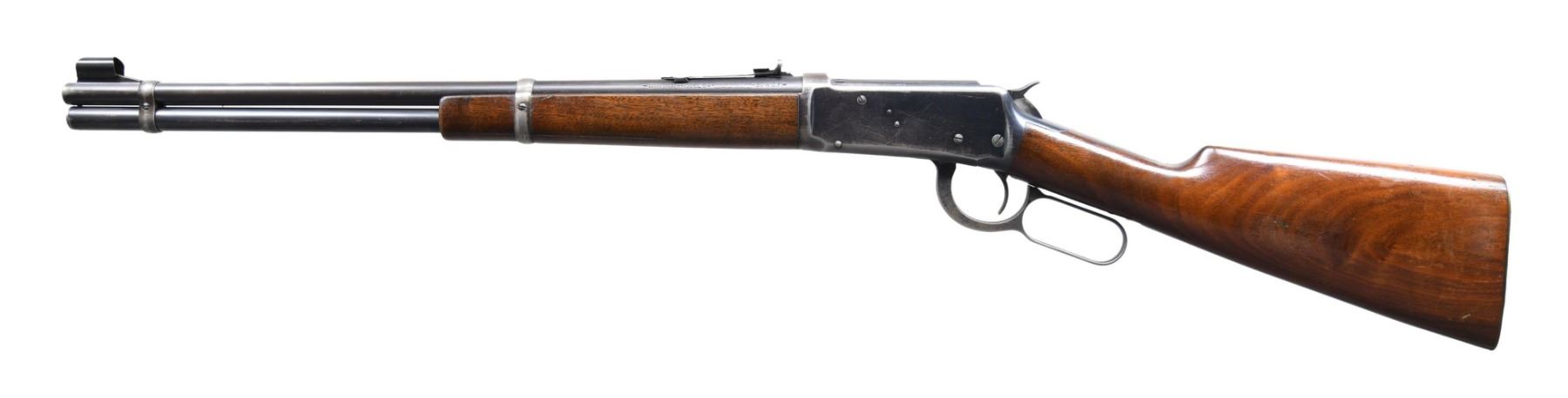 Cal. 30 WCF. S# 1202991. Bbl. 20" with hooded ramp bead front sight and sporting rear sight. Full-length mag. Long wooden forearm and straight grip stock with curved steel buttplate. Mfg. 1942. CONDITION: 70% lightly faded blue, showing edge and carry wear. Stock and forearm show wear and handling marks with an added finish. Very good bore. (24-5718/DS). CURIO. $500-800.