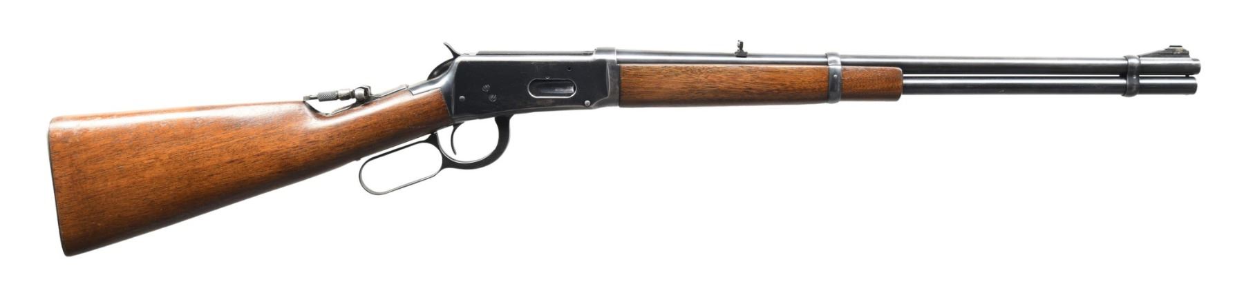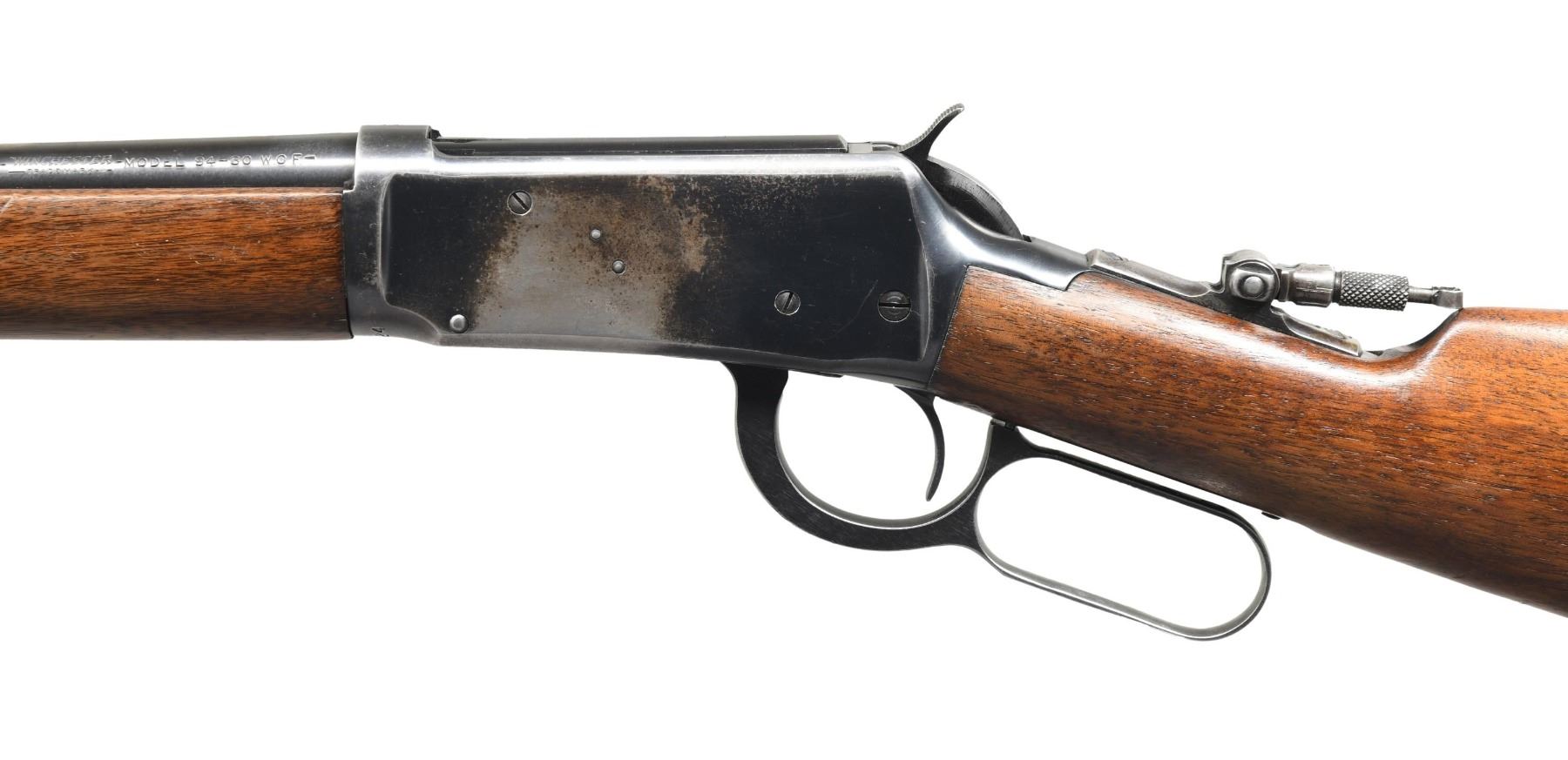Cal. 30 WCF. S# 1575624. Bbl. 20". Model 94 lever action rifle mfg. by Winchester in 1949. Left side of the bbl. is marked with Winchester's mfg. information, followed by the Winchester trademark logo, as well as the model and cal. designations. Metal components exhibit a blue finish overall. Plain wood straight grip buttstock and forend. Tip of the comb on the buttstock has been inletted, likely for the tang-mounted rear sight. Ramped and aluminum beaded blade front sight with later production flip-up U-notch rear sight. Receiver tang is mounted with a flip-up aperture rear sight. CONDITION: metal components retain large amounts of their original factory blue finish, with some areas of wear and thinning overall. Receiver exhibits areas of wear and thinning, with some scattered spots of oxidation and cleaned pitting. Very bright bore, exhibiting a few spots of light pitting and/or surface oxidation while retaining strong rifling throughout. Wood furniture shows some scattered marks and minor impressions from handling and storage, but otherwise remains sturdy and serviceable. (24-3832/MLW). CURIO. $400-600.