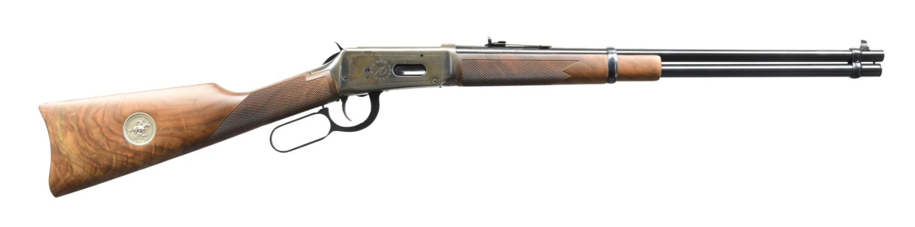 BICENTENNIAL LEVER ACTION CARBINE WITH MATCHING FACTORY BOX. Cal. 30-30. S# USA19384. Bbl. 20". Model 94 lever action carbine mfg. by Winchester commemorating the United States' Bicentennial. Left side of the bbl. is marked with the Winchester trademark logo, followed by the model and cal. designations, with "Bicentennial 1776-1976 marked on the right. Left side of receiver is engraved with a patriotic eagle, with "76" encompassed in stars on the right. Receiver exhibits a case color hardened finish, with the lever, saddle ring, hammer, buttplate, bbl., mag. tube, and bbl. bands exhibiting a blue finish. Nicely figured checkered wood straight grip buttstock and forend. Blade front sight with U-notch rear sight. UNATTACHED ACCESSORIES: matching factory styrofoam insert with sleeve, remaining mostly sealed (save for one end) in what appears to be period paper packaging. CONDITION: near new, with metal components retaining bountiful amounts of their original factory applied finishes overall. Mirror bore, exhibiting what appears to be grease while retaining well-defined rifling throughout. Wood furniture is excellent overall. Insert and sleeve appear very good overall. (24-2877/MLW). MODERN. $600-900.