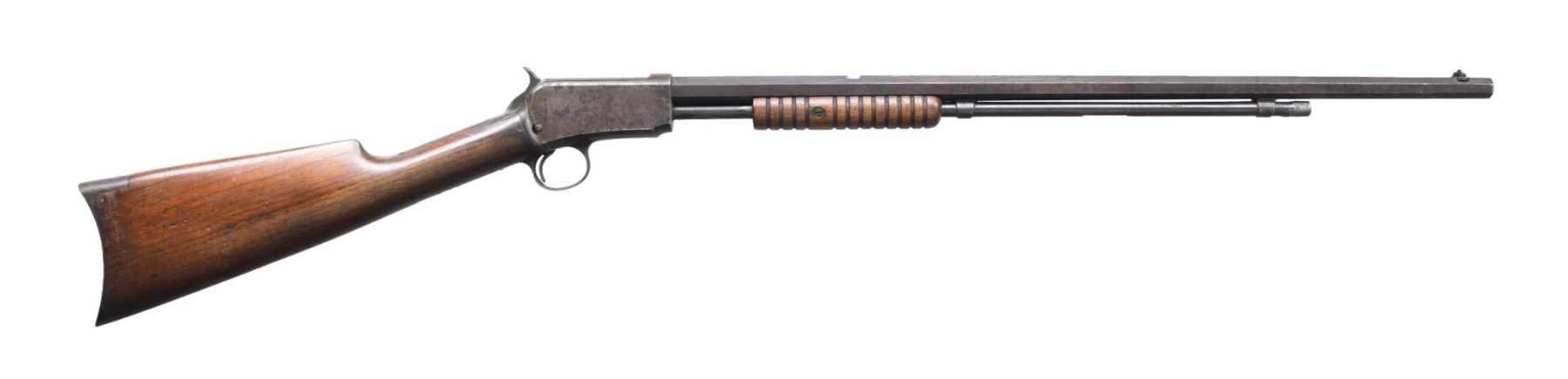 Cal. 22 WRF. S# 317547. Bbl. 24". Model 1890 slide action rifle mfg. by Winchester in 1907. Top flat of the octagonal bbl. is marked with Winchester's mfg. and patent information, followed by the model designation, with "22 W.R.F." marked towards the breech. Metal components exhibit a blue finish overall. Plain wood straight grip buttstock with grooved wood pump. Combination front sight, with globe sight having broken off and being absent. Rear sight is absent. Buttstock screws on the tang are absent. CONDITION: metal components retain trace to fair amounts of their original factory blue finish, exhibiting wear and thinning that shows through to gray and brown patinas, as well as areas of mild to moderate oxidation and pitting overall. Dark pitted bore, exhibiting strong rifling throughout. Wood furniture shows scattered marks and impressions from handling and storage, with the buttstock exhibiting a 1 5/8" gouge on the left side. (24-3824/MLW). CURIO. $300-400.
