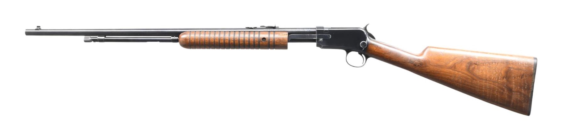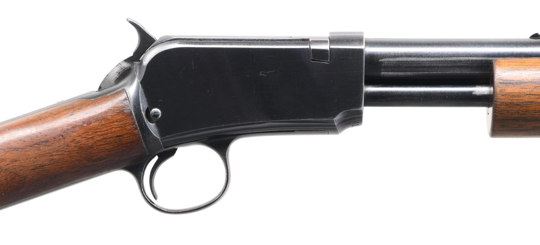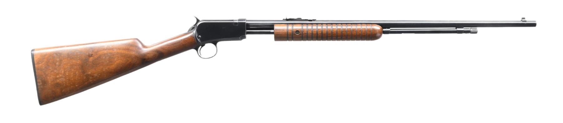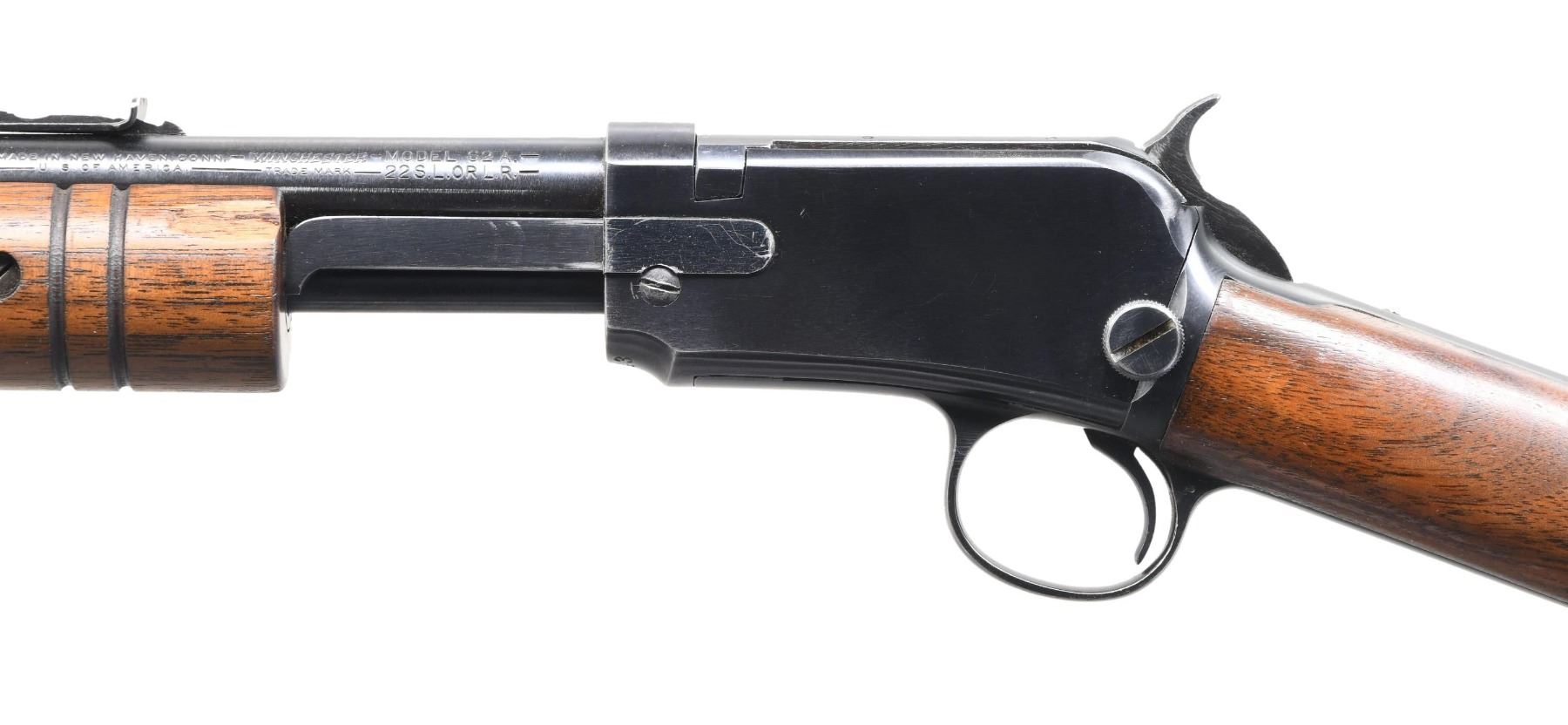 Cal. 22 S,L,LR. S# 110943. Bbl. 23", round. Large, round, grooved slide handle, and straight grip walnut stock with original buttplate. Mfg. 1940. CONDITION: 90% lightly worn blue. Stock shows numerous small spots of finish loss with scattered scratches and marks. Very good, bright bore. PROVENANCE: from the lifelong collection of Jim Williams. (24-2712/DS). CURIO. $500-750.