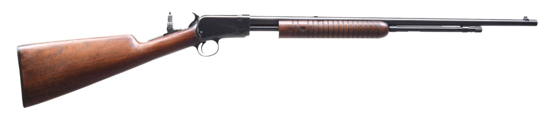 Cal. 22 S,L,LR. S# 135143. Bbl. 23" round. Sporting front sight, filler in rear dovetail w/ a King push button combination tang sight. Tubular mag. Left side of action has plug screws in 2 added holes for apparent scope attachment. Large round grooved forearm & straight grip walnut stock w/ original buttplate. Mfg. 1941. CONDITION: 90% blue showing slide & edge wear. Wood has lightly worn finish showing scratches, marks & mildew spots. Bright near excellent bore. (24-5169/DS). CURIO. $400-600.