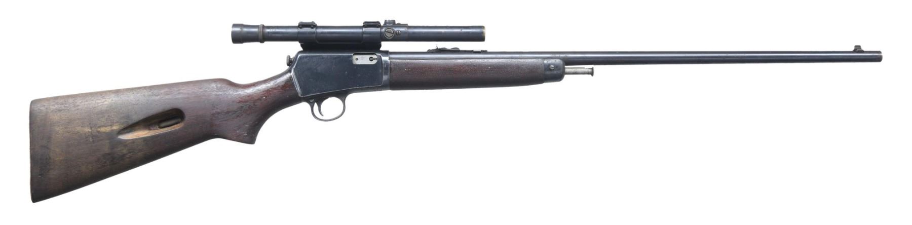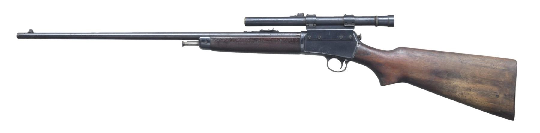 Cal. 22 LR. S# 106493A. Bbl. 23" round w/ original sporting sights. Weaver B4 scope w/ standard crosshairs on N5 side-mount. Action operating rod is located at front of forearm. Walnut forearm & pistol grip stock w/ checkered steel buttplate. Tubular mag. inserts through buttplate & loads on right side of stock. CONDITION: 70% lightly faded blue showing handling marks & spots of surface corrosion. Wood has added finish over water damage. Buttplate & mag. tube knob have heavy surface rust & pitting. Top buttplate screw is missing. Bore is generally bright w/ good rifling. Scope has cloudy optics. (24-4170/DS). CURIO. $200-400.