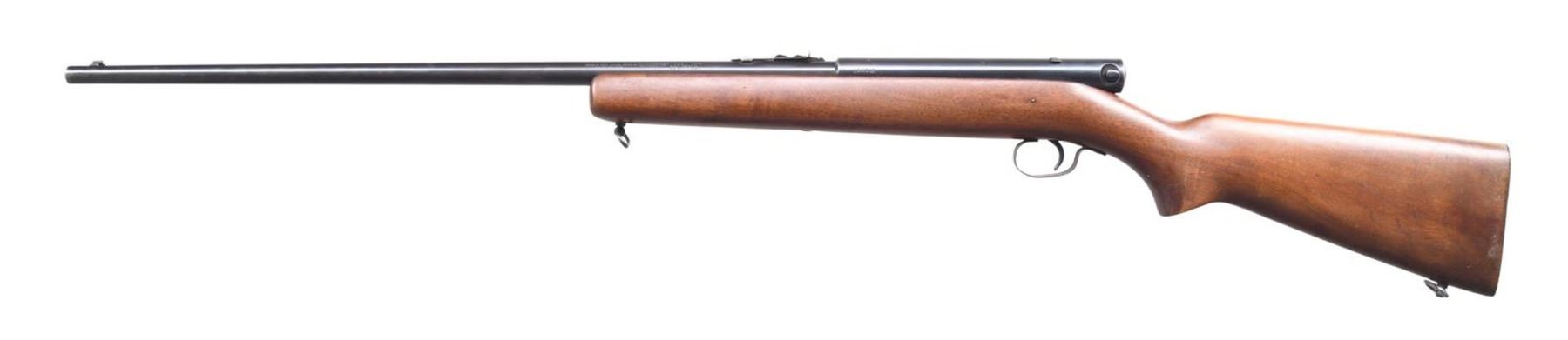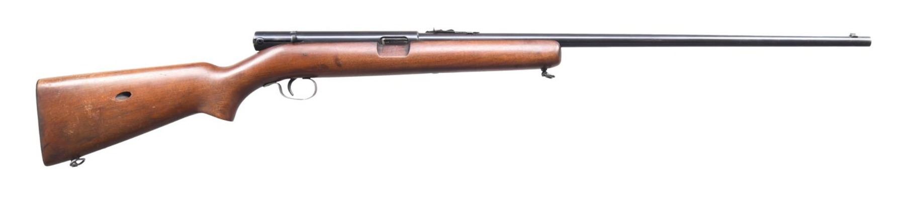 Cal. 22 LR. S# 118746. Bbl. 24", round with original sporting sights. Walnut stock has added sling swivels. The tubular mag. inserts through the checkered steel buttplate and loads through the right side. CONDITION: 90% lightly faded blue, showing edge wear. The original stock finish shows wear with handling marks and spots of finish loss. Very good, bright bore. (24-792/DS). CURIO. $250-350.