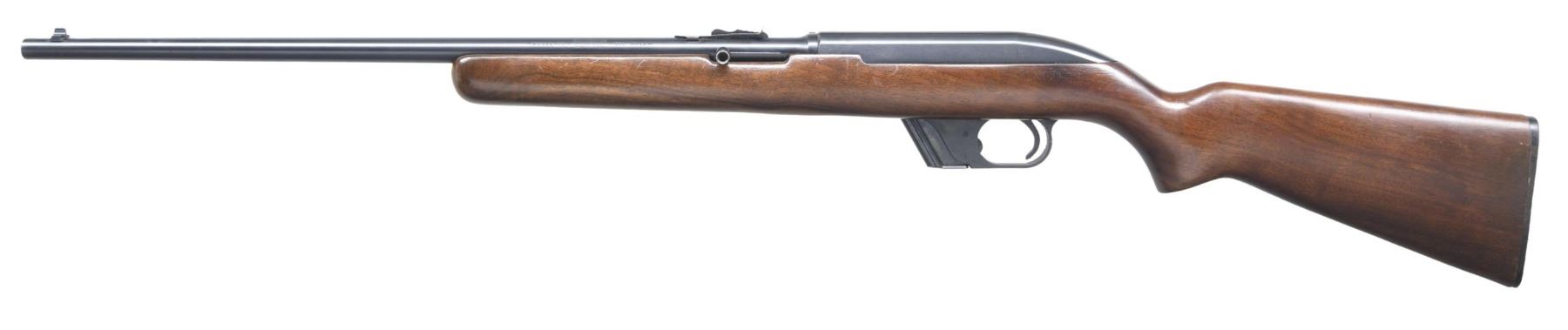 Cal. 22 LR. NSN. Bbl. 22". Model 77 semi-automatic rifle mfg. by Winchester. Left side of the bbl. is marked with the model designation, followed by the Winchester trademark logo, and the cal. designation. Metal components exhibit a blue finish overall. 1-piece plain wood pistol grip buttstock, with black plastic trigger guard. Aluminum beaded blade front sight, with U-notch rear sight. MAGS: 1 7-rd. CONDITION: excellent, with metal components retaining bountiful amounts of their original factory blue finish, exhibiting a few small spots of light surface oxidation, as well as a few light superficial handling marks overall. Mirror bore, exhibiting well defined rifling throughout. Stock exhibits some scattered superficial marks and a few minor impressions from handling and storage, but otherwise remains sturdy and serviceable. (24-5188/MLW). CURIO. $125-175.