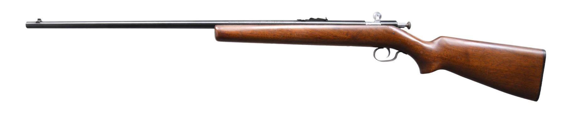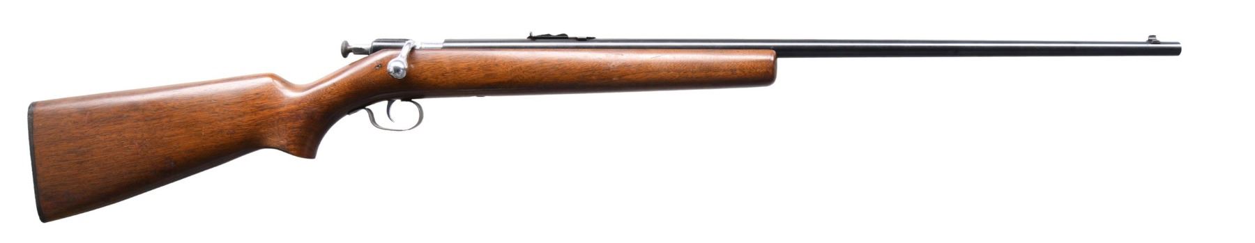 Cal. 22 S, L, LR. NSN. Bbl. 27 1/8". Model 67 single shot bolt action rifle mfg. by Winchester. Left side of the bbl. exhibits markings stipulating Winchester's mfg. information, as well as the model and cal. designations. Metal components exhibit a blue finish, save for on the bolt and trigger, which exhibit a nickel-plated finish. One-piece plain wood pistol grip buttstock. Blade front sight, with U-notch rear sight. CONDITION: very good, with metal components retaining the majority of their original factory finishes, exhibiting a few spots of light wear, scattered superficial handling marks, as well as some spots of light surface oxidation overall. Trigger guard exhibits areas of wear and thinning that show through to gray and brown patinas. Mirror bore, exhibiting well-defined rifling throughout. Stock shows scattered marks and minor impressions from handling and storage, but otherwise remains sturdy and serviceable. (24-5755/MLW). CURIO. $100-200.
