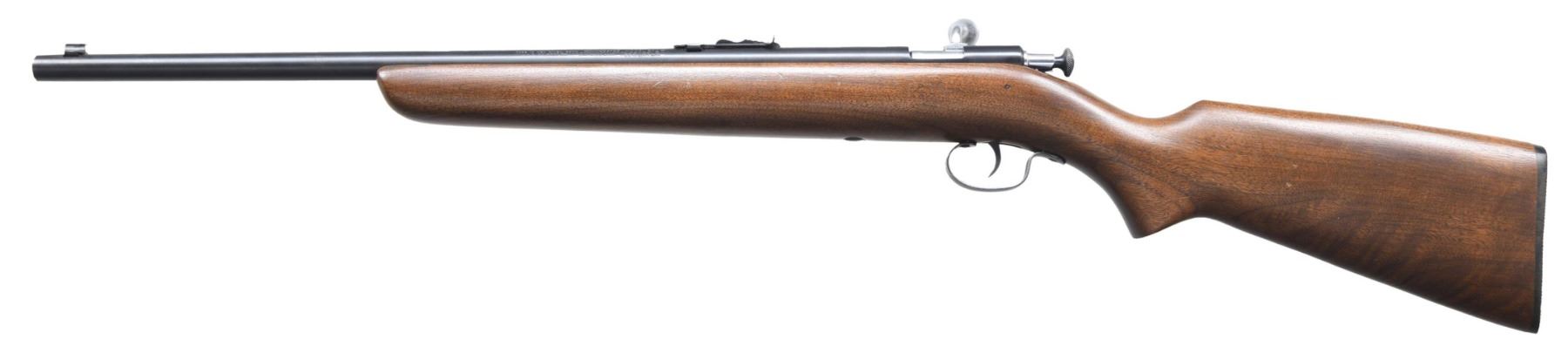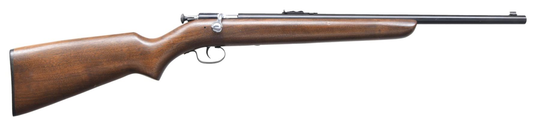 RIFLE. Cal. 22 S, L, LR. NSN. Bbl. 19 7/8". Model 67A single shot bolt action "Boys" rifle mfg. by Winchester. Left side of the bbl. is marked with Winchester's mfg. information, followed by the Winchester trademark logo, as well as the model and cal. designations. Metal components exhibit a blue finish overall, save for on the bolt, which exhibits a nickel-plated finish. One-piece plain wood pistol grip buttstock. Brass beaded blade front sight, with U-notch rear sight. CONDITION: excellent, with metal components retaining the vast majority of their original factory finishes, exhibiting a few small spots of light wear, as well as a few scattered superficial handling marks overall. Mirror bore, exhibiting well-defined rifling throughout. Wood stock shows scattered marks and minor impressions from handling and storage, but otherwise remains sturdy and serviceable. (24-5756/MLW). CURIO. $200-300.
