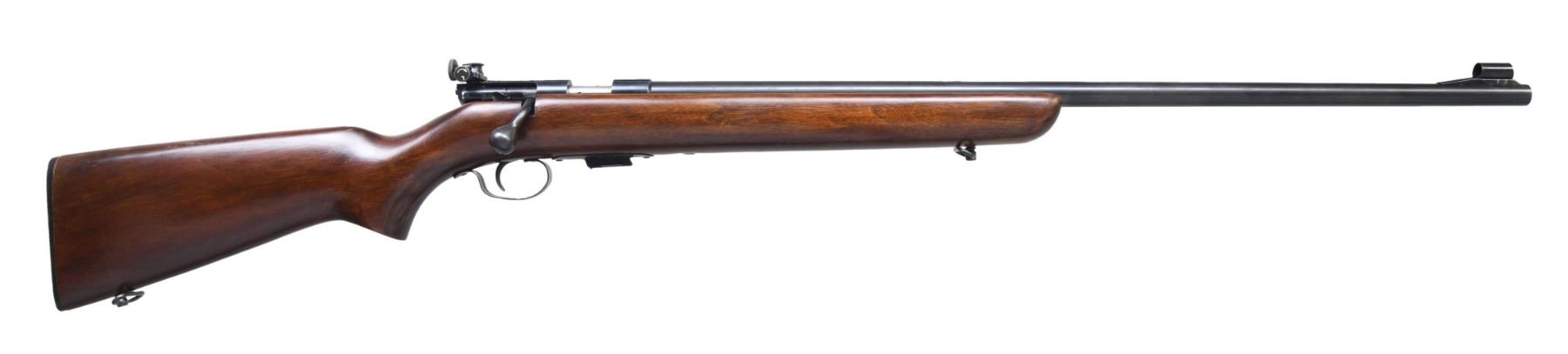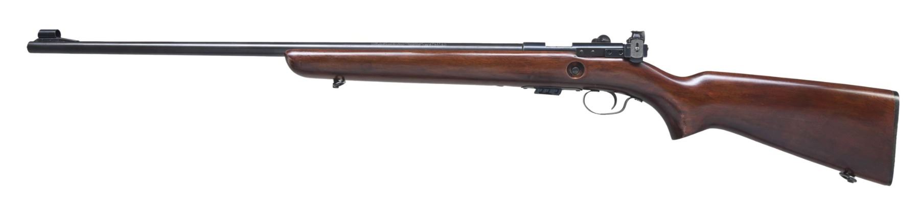 Cal. 22 S,L,LR. NSN. Bbl. 25" round. Hooded ramp bead front sight w/ Lyman receiver sight. Left side of receiver has 2 additional plugged holes for sight attachment. Receiver is grooved for tip-off scope mounts. Walnut stock w/ original buttplate & added sling swivels. MAGS: 1 detachable 5 rd of replacement style w/ W marked floorplate. CONDITION: 90% original blue. Refinished wood shows wear spots w/ scattered handling marks. Very good bore. (24-5092/DS). CURIO. $300-400.