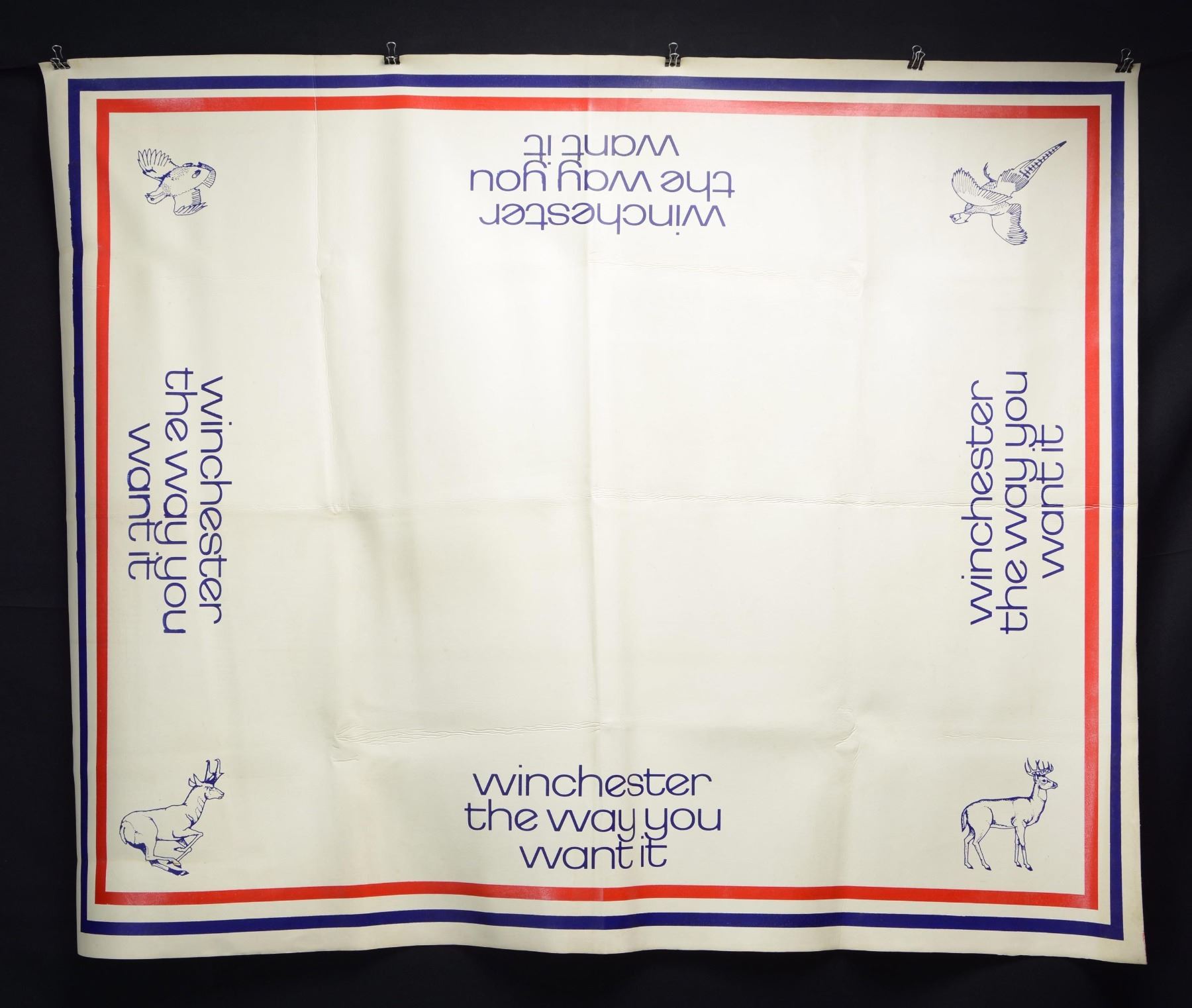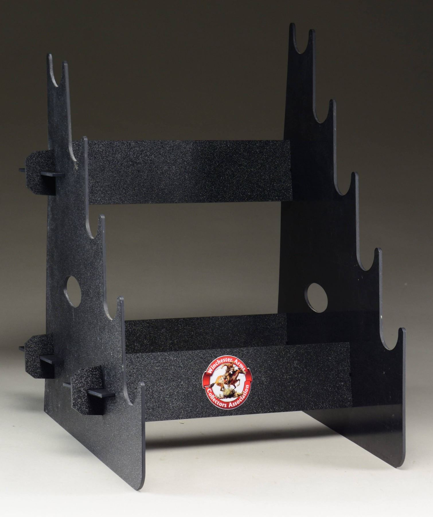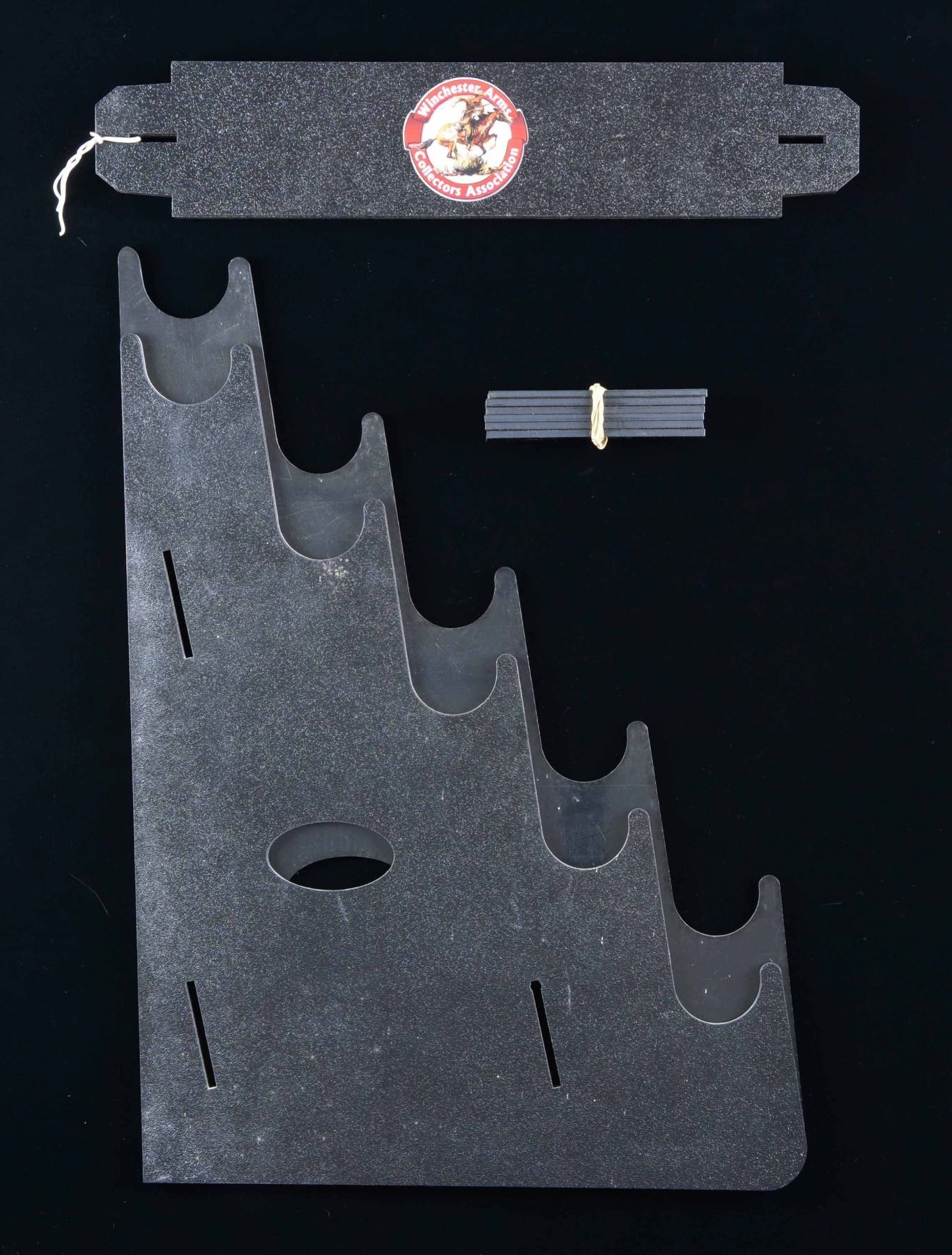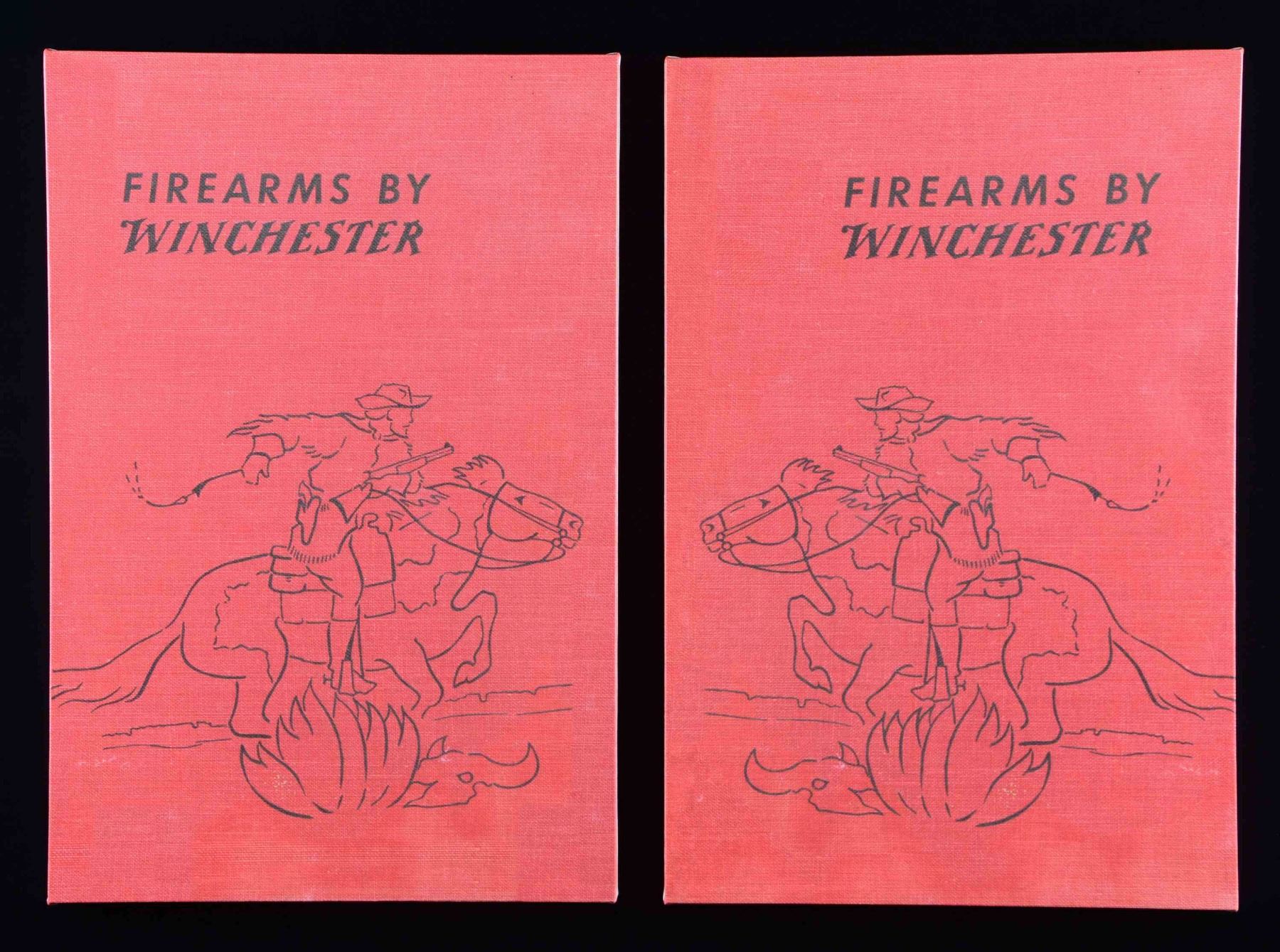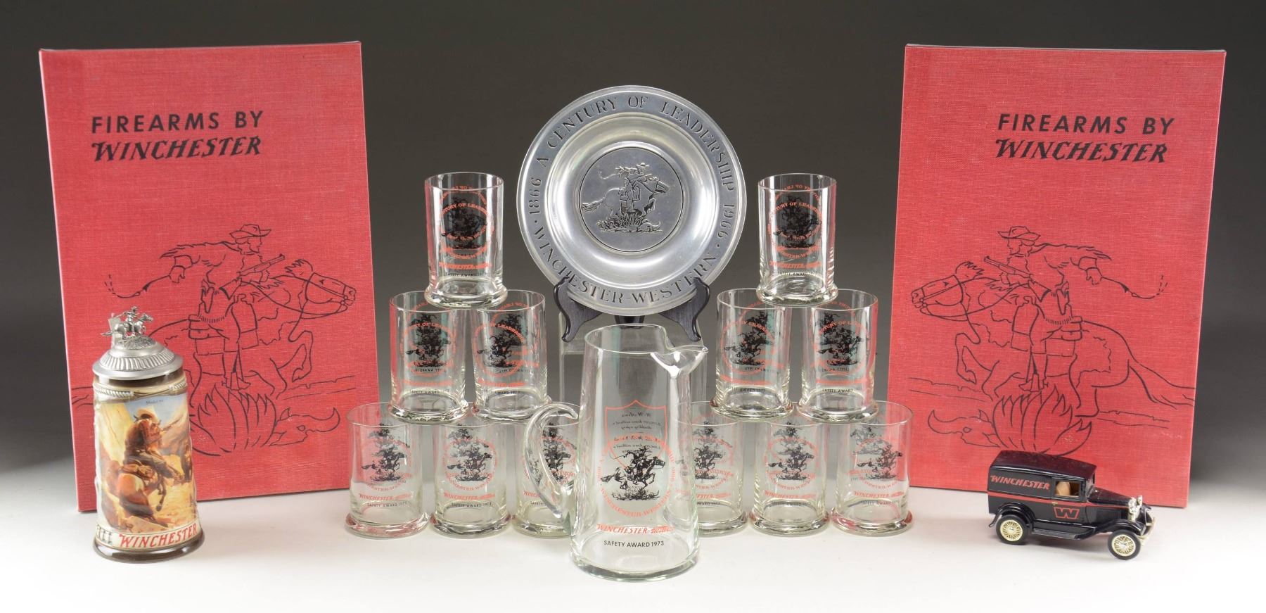 No. 1: 1973 safety award pitcher & set of 12 beer glasses. All items have horse & rider motifs in center of marking, "1866 A Century of Leadership 1966 Winchester-Western". Pitcher is marked "W-W Arms / 3,500,000 hours without a / disabling injury / M.H. W-W Group / 4,500,000 without a disabling injury". No. 2: Winchester limited edition anniversary Stein. Stein pictures a horse & rider w/ a Winchester 95 confronting a grizzly on a narrow mountain trail. Pewter top is capped by the Winchester horse & rider. Original foam lined box pictures a Winchester 1894-1994 commemorative rifle. No. 3: Pewter plate w/ horse & rider motif on bottom. Rim is marked "1866 A Century of Leadership 1996 Winchester-Western". No. 4: Model of a Ford Sedan Delivery. Black in color w/ red Winchester markings. No. 5: Winchester Arms Collector's Association marked takedown plastic 4 gun display rack. No. 6: 2 framed red canvas art pieces titled "FIREARMS BY WINCHESTER". Both depict the horse & rider heading east on one drawing & left on the other. Height: 18". Width: 12". Mfg. by ArtPrint Studio, Stonington, CT. No. 7: White Vinyl counter mat measuring 54" x 43 1/2". All 4 sides are labeled "Winchester the way you want it". Corners have a white tailed deer, pronghorn antelope, flying pheasant & quail. Outer edges have blue & red stripe borders. CONDITION: all items, unless otherwise stated, are in good to very good condition. (02-22361-1/DS). NON-GUN. $300-600.