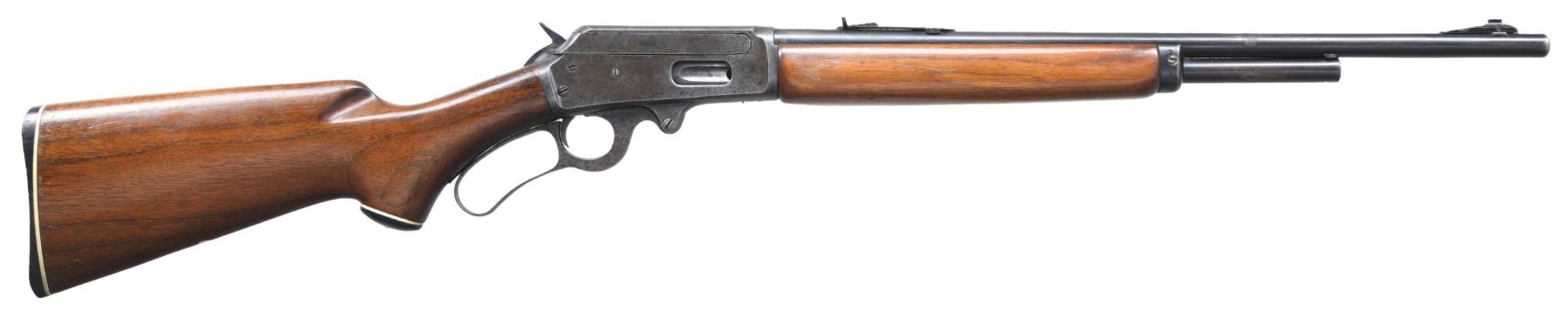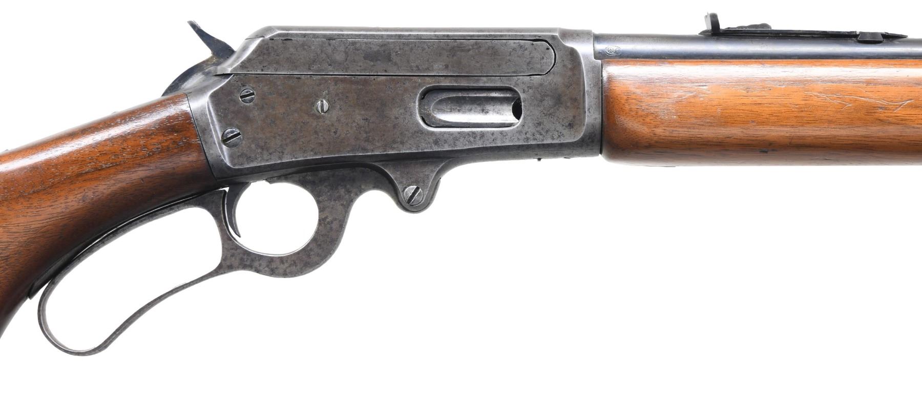 Cal. 32 WS. S# B1757. Bbl. 20 3/8". Model 1936 lever action rifle mfg. by Marlin Firearms Co. Left side of the bbl. exhibits markings stipulating Marlin's mfg. information, as well as the cal. designation. Upper receiver tang is marked "Marlin/ MODEL 1936", with the S# marked on the lower tang. Frame and lever exhibit a case color hardened finish, with remaining metal components exhibiting a blue finish overall. Later production plain wood pistol grip buttstock, with black synthetic grip cap, and plain wood forend. Forend appears to have been sanded and revarnished at one time. Ramped aluminum beaded blade front sight, with V-notch rear sight. CONDITION: frame and lever retain traces of their original case color hardened finish, with the balance exhibiting a gray patina and areas of pitting overall. Blued parts retain fair amounts of their original finish, exhibiting wear and thinning that shows through to brown patina. Bright bore, exhibiting scattered areas of light to mild pitting, while retaining well defined rifling throughout. Wood furniture shows scattered marks and minor impressions from handling and storage, but otherwise remains sturdy and serviceable. (24-4854/MLW). CURIO. $400-600.