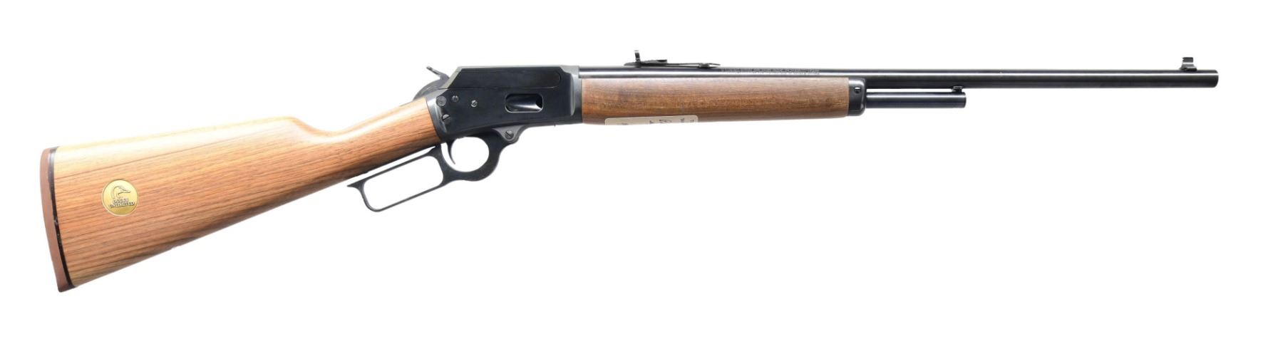 Cal. 25-20. S# 10065596. Bbl. 22". Gold bead front sight. Adjustable sporting-style rear sight. Blued finish. Crossbolt safety. JM-marked bbl. Plain walnut stock and forend with factory rubber buttpad. Underside of the forend has a Marlin factory test sticker. Right side of butt has a gold-colored Ducks Unlimited disc. CONDITION: stock set shows some light handling wear; other aspects are near excellent. (24-3210/MJC). MODERN. $400-600.