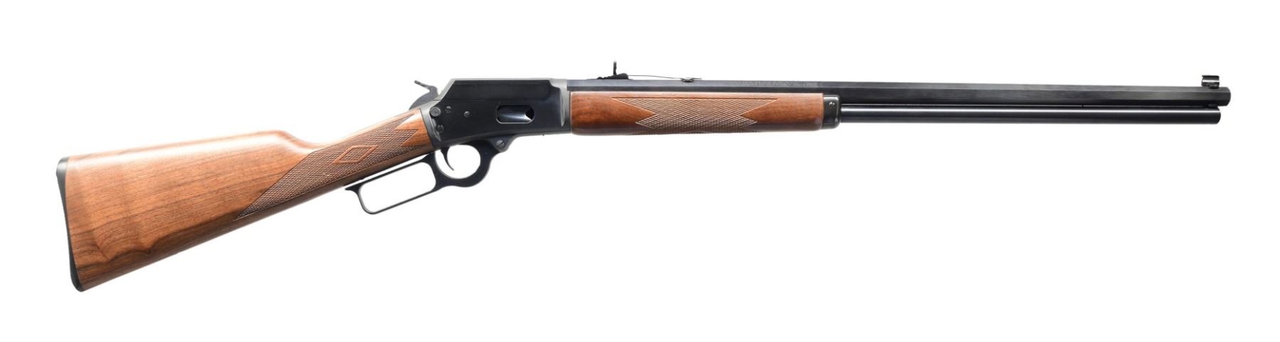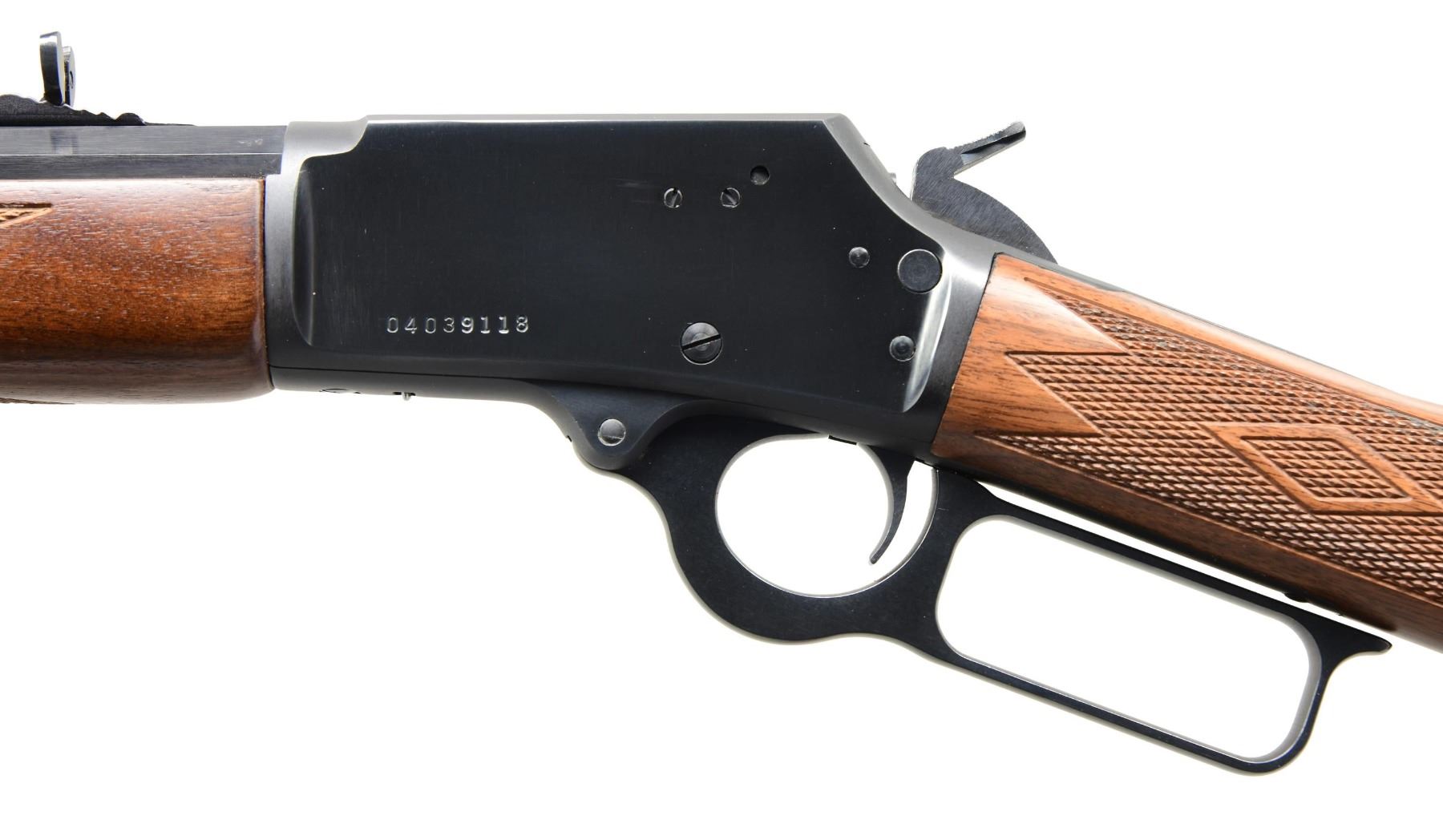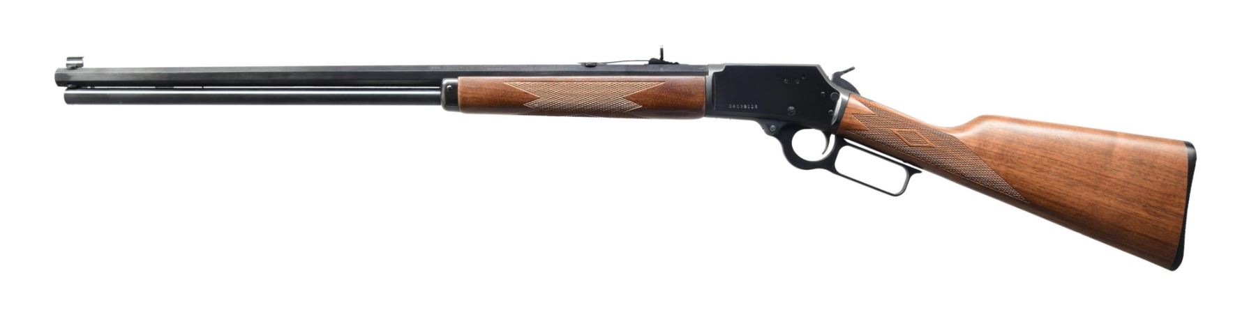 Cal. 45 Colt. S# 04039118. Bbl. 24", octagonal. Gold bead front sight. Adjustable sporting rear sight. New Haven, CT-made 1894 Cowboy Ltd. rifle. Blued finish. Checkered walnut stock set. CONDITION: stock set shows a couple light dings; other aspects are near excellent. (24-3133/MJC). MODERN. $500-700.