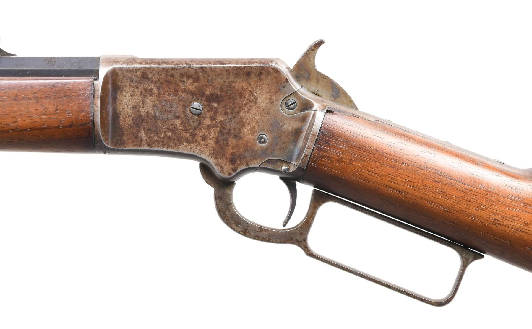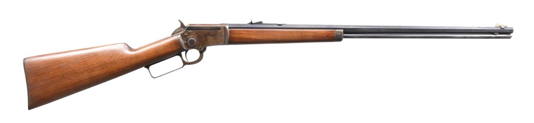 Cal. 22 S, L, LR. S# 334587. Bbl. 24" tapered octagon. German silver blade rocky mountain front sight w/ sporting rear sight. Full length tubular mag. Blue finished w/ case colored action. Walnut forearm & straight grip stock w/ hard rubber buttplate. CONDITION: bbl. & mag. tube retain 40% dull fading blue. Action has faded to mottled gray brown w/ small amounts of case colors visible in protected areas. Sanded & refinished wood. Stock has an epoxy repaired chip left of top tang. Lightly pitted bore w/ worn rifling. PROVENANCE: From the Collection of a Tennessee Gentleman. (24-4488/BH). CURIO. $500-700.