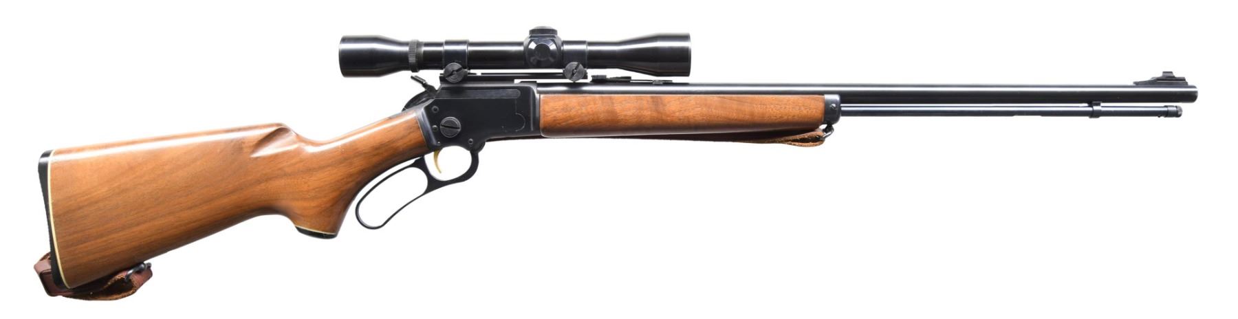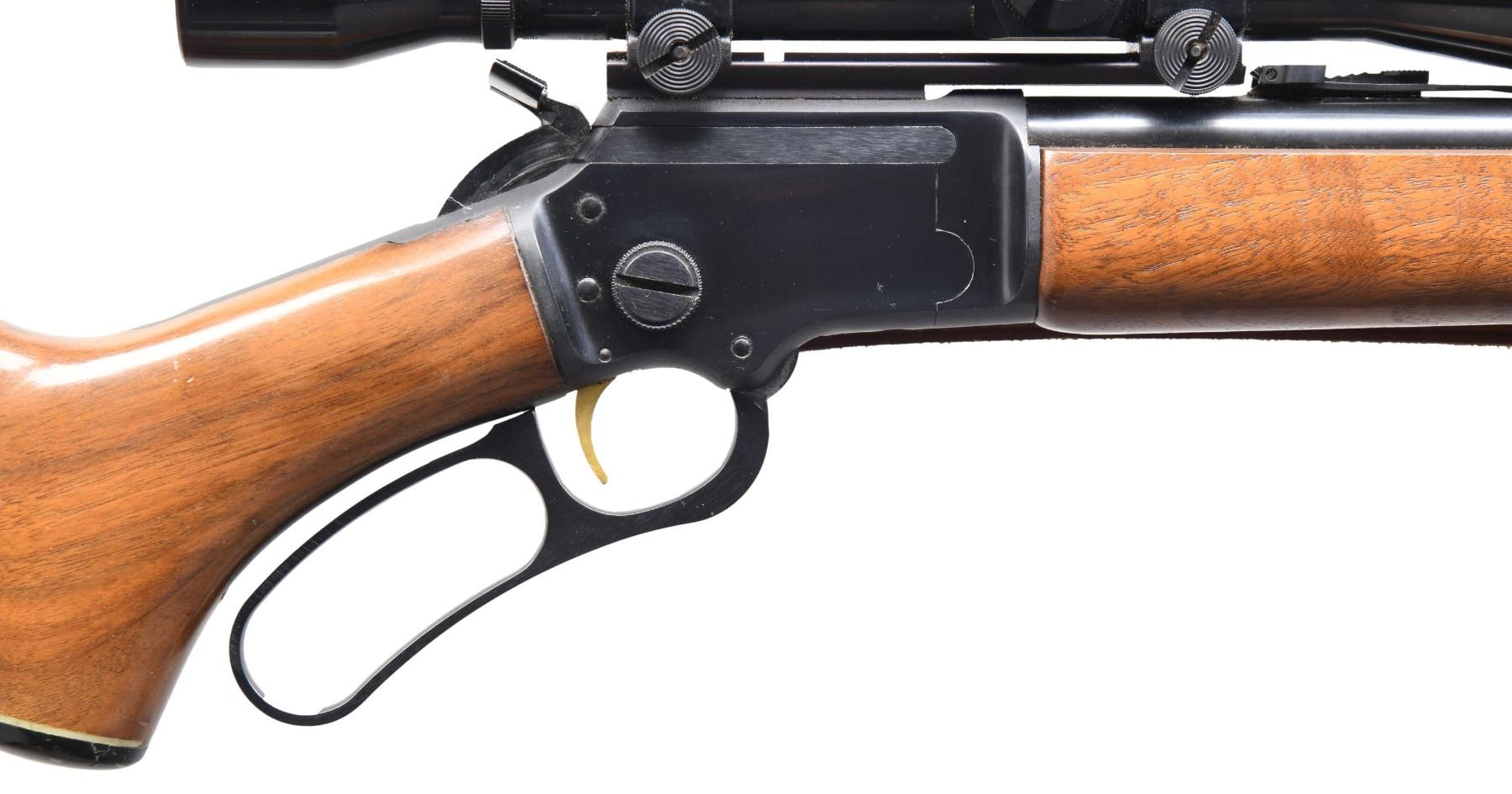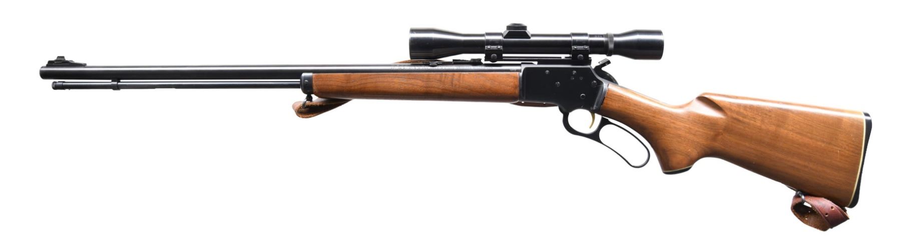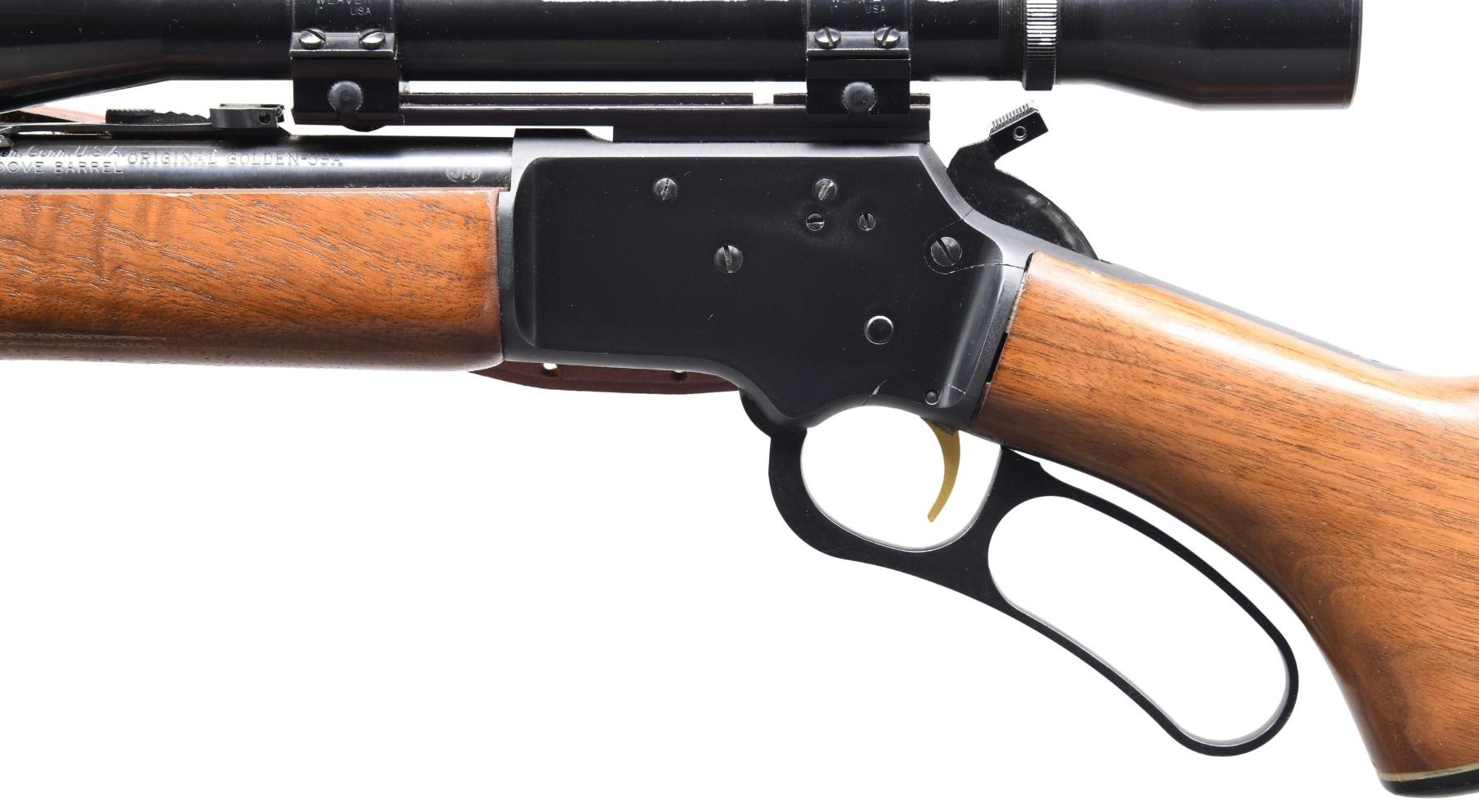 Cal. 22 S, L, LR. S# 21252239. Bbl. 24". Golden 39A lever action rifle mfg. by Marlin. Left side of the bbl. exhibits markings stipulating Marlin's mfg. information, as well as the model and cal. designations. Metal components exhibit a blue finish overall. Plain wood pistol grip buttstock and forend. Ramped blade front sight, with flip-up U-notch rear sight. Receiver is mounted with a Weaver Marksman 4x scope. CONDITION: metal components retain the majority of their original factory blue finish, exhibiting some light wear as well as some superficial handling marks overall. Mirror bore, exhibiting well-defined rifling throughout. Wood furniture shows some scattered marks from handling and storage but otherwise remains sturdy and serviceable. Scope retains a clear optic. (24-5312/MLW). MODERN. $500-750.