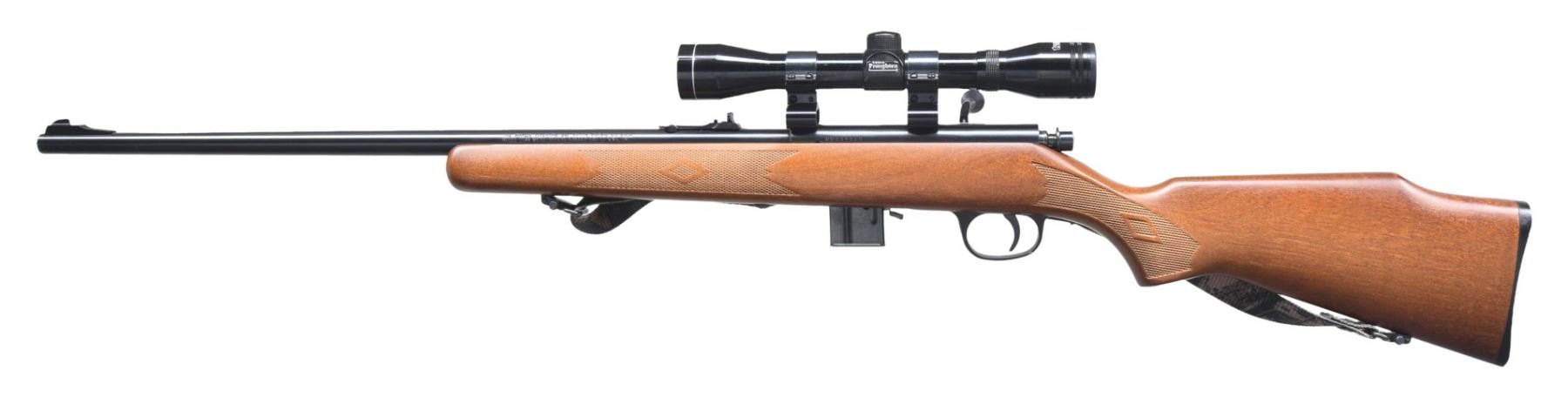 Cal. 22 WMR. S# 00344966. Bbl. 22". Model 25MN bolt action rifle mfg. by Marlin Firearms Co. Left side of the bbl. is marked with Marlin's mfg. information, as well as the model and cal. designations. Left side of the receiver is marked with the S#. Metal components exhibit a blue finish overall, save for the aluminum trigger guard, which exhibits a black enamel finish. One-piece checkered wood Monte Carlo pistol grip buttstock. Ramped blade front sight, with U-notch rear sight. Grooved receiver is mounted with a Tasco Pronghorn 4x32 scope. MAGS: one blued and two stainless steel 7-rd. mags. CONDITION: excellent, with metal components retaining bountiful amounts of their original factory blue finish, exhibiting a few minor superficial handling marks, as well as a couple of spots of light surface oxidation overall. Mirror bore, exhibiting well-defined rifling throughout. Scope retains a clear and sharp optic. PROVENANCE: from the collection of a Tennessee gentleman. (24-4485/BH). CURIO. $400-600.
