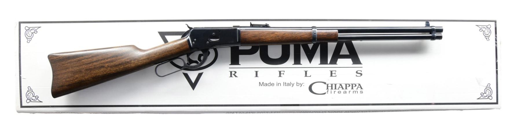 CARBINE WITH MATCHING FACTORY BOX. Cal. 44 Mag. S# T4350. Bbl. 20". Model 1892 Puma lever action saddle ring carbine mfg. in Italy by Chiappa and imported by Chiappa Firearms. Top of the bbl. is marked with Chiappa's importer and mfg. information, with the cal. designation marked towards the breech. Underside of receiver exhibits Italian proofs and the S#. Metal components exhibit a blue finish overall. Plain wood straight grip buttstock and forend. Blade front sight and square notch rear sight with flip-up sight ladder. UNATTACHED ACCESSORIES: matching factory box. CONDITION: excellent, with metal components retaining the vast majority of their original factory blue finish, exhibiting what appears to be light wear/thinning and/or discoloration to the bluing on the receiver. Mirror bore, exhibiting some spots of grease while retaining well-defined rifling throughout. Action functions appropriately when cycled by hand. Wood furniture is excellent overall. Box shows mild exterior wear but otherwise remains sturdy and serviceable. (24-3475/MLW). MODERN. $300-500.