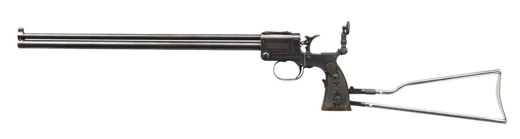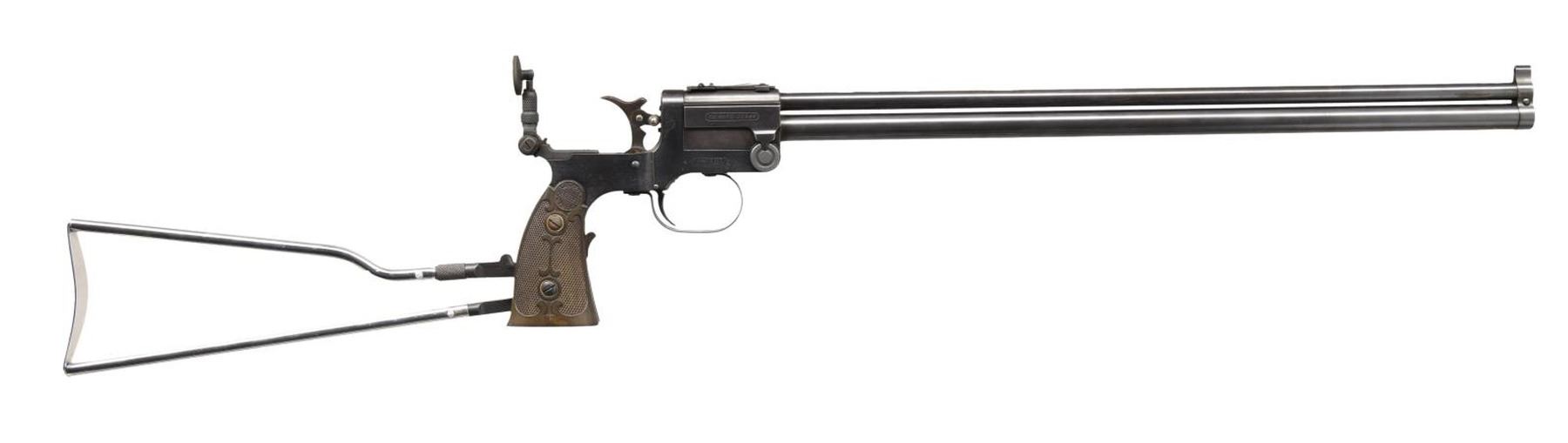 Cal. 22 LR / 44 Shotshell. S# 1274. Bbl. 18 1/8". Model 1908 Game Getter combination gun mfg. by the Marble Safety Axe Co. of Gladstone, MI. The left side of the breechblock is marked "-MANUFACTURED BY THE-/ MARBLE SAFETY AXE CO./ -GLADSTONE, MICH.U.S.A.", with the cal. designation on the right. Frame is marked "GAME GETTER" on the left, with "PATENT/ ALLOWED" within an oval on the right. S# is stamped on the interior of the frame, beneath the breechblock. Major metal components exhibit a nicely reapplied blued finish with the hammer exhibiting a case color hardened finish and the under-folding skeleton stock exhibiting a nickel plated finish. Frame is mounted with 2-piece Marbles checkered brown hard rubber grips. Brass beaded blade front sight with breech mounted flip-up rear sight and tang mounted Marble's aperture rear sight. CONDITION: very good with major metal components retaining the majority of their reapplied blue finish plus some areas of light wear and thinning overall. Some spots of light surface oxidation. Mirror bores with the .22 bore exhibiting well defined rifling throughout. Grips show some scattered marks from storage and handling with the bottom of the left panel exhibiting a small chip at the rear. PROVENANCE: from The Estate of Harry Henry. (24-3926/MLW). CURIO. $900-1,400.