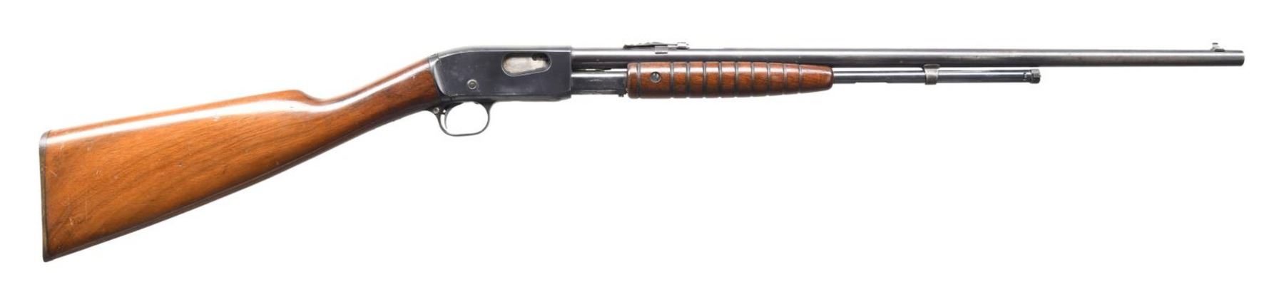 Cal. 22 S, L, LR. S# 345252. Bbl. 22". Model 12 slide action rifle mfg. by Remington UMC. The top of the bbl. is marked with Remington UMC's mfg. and patent information, with the Remington trademark logo and cal. designation marked at the breech. Lower receiver tang is marked with the Remington UMC trademark logo. Metal components exhibit a blued finish overall. Plain wood straight grip buttstock with grooved pump. Blade front sight with V-notch rear sight. CONDITION: metal components retain large amounts of their original factory blue finish, exhibiting flecks of light surface oxidation and pitting overall, with wear and striations on the bbl. that show through to patina as the result of former cleaning. Bright bore, exhibiting scattered spots of pitting and good rifling throughout. Wood furniture shows some scattered marks from handling and storage, but otherwise remains sturdy and serviceable. (24-4/MLW). CURIO. $300-400.