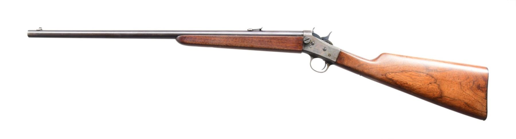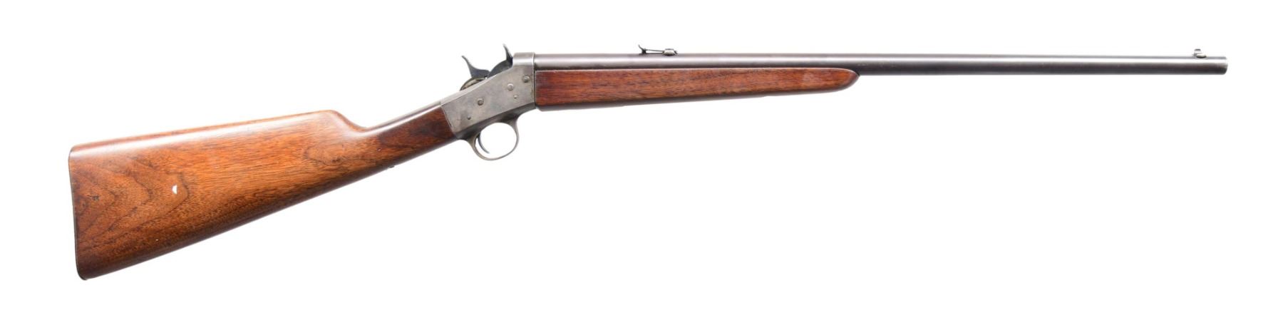 Cal. 22 S, L, LR. S# 342086. Bbl. 22 1/2". Model 4 single-shot Rolling Block rifle mfg. by Remington Arms Co. The top of the bbl. is marked with Remington's mfg. information, with the Remington trademark logo and cal. designation marked towards the breech. Frame exhibits a case color hardened finish, with the hammer, breechblock, trigger, and bbl. exhibiting a blue finish overall. Plain wood straight grip buttstock and forend have been sanded and revarnished. Blade front sight with V-notch rear sight. Matching numbers are present on the receiver and bbl. CONDITION: frame retains traces of its original factory case color-hardened finish, with fading and wear to a gray patina present overall. Blued components retain the majority of their original factory finish, exhibiting some wear and thinning, with light surface oxidation present overall. Mirror bore, exhibiting well-defined rifling throughout. Wood furniture shows some scattered marks and minor impressions from handling and storage, but otherwise remains sturdy and serviceable. (24-3855/MLW). CURIO. $200-400.