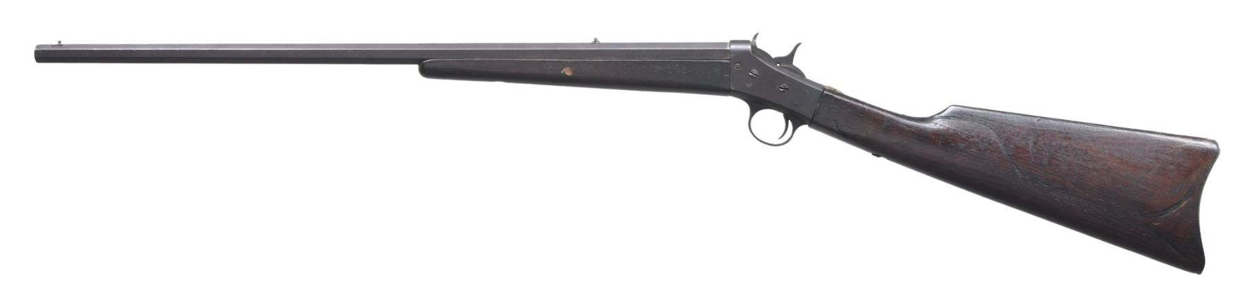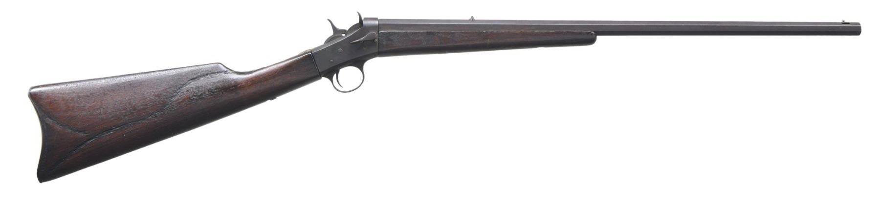RIFLES. 1) REMINGTON NO. 4 TAKEDOWN ROLLING BLOCK RIFLE. Cal. 22 RF. NSN. Bbl. 22 5/8". No. 4 takedown rolling block rifle mfg. by Remington. Top flat of the octagonal bbl. is marked with Remington's mfg. information. Plain wood straight grip stock and forend. Sides of buttstock have been carved. Custom period made blade front sight, with U-notch rear sight. Upper receiver tang exhibits a brass repair. CONDITION: metal components exhibit a dark gray patina, with pitting and oxidation present overall. Poor bore, exhibiting pitting, while retaining trace rifling throughout. Wood furniture shows scattered marks from handling and storage, with the buttstock exhibiting a crack on the left side of the wrist, that stems from the receiver tang. (24-5081/MLW). 2) REMINGTON NO. 4 TAKEDOWN ROLLING BLOCK RIFLE. Cal. 22 RF. S# J205226. Bbl. 22 5/8". No. 4 takedown falling block rifle mfg. by Remington. Top flat of the octagonal bbl. is marked with Remington's single line address. Bbl. exhibits a blue finish. Plain wood straight grip buttstock and forend have been sanded and revarnished, with the left side of the buttstock exhibiting a faintly carved "PM". Blade front sight, with U-notch rear sight. CONDITION: frame exhibits a mottled gray patina, with areas of age related discoloration. Bbl. retains large amounts of its original factory blue finish, exhibiting edge wear, with varying degrees of oxidation overall. Breechblock lever tip is chipped. Fair bore, exhibiting scattered pitting, while retaining good rifling throughout. Wood furniture shows scattered marks, impressions, and a few gouges from handling and storage, with drying, finish loss, and a crack present at the toe of the buttstock. (24-5091/MLW). BOTH CURIO. $150-250.