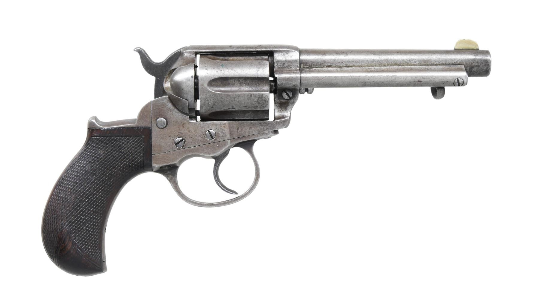 Cal. 41 Colt. S# 21616. Bbl. 4 1/2" with replacement brass blade front sight. Sixshot fluted cyl. One-piece checkered walnut bird head grip. Mfg. 1880. CONDITION: metal has a faded brown appearance. Grips show light finish and checkering wear. Action will not cycle or function properly. Lightly pitted bore with worn rifling. (01-25824/DS). ANTIQUE. $200-300.