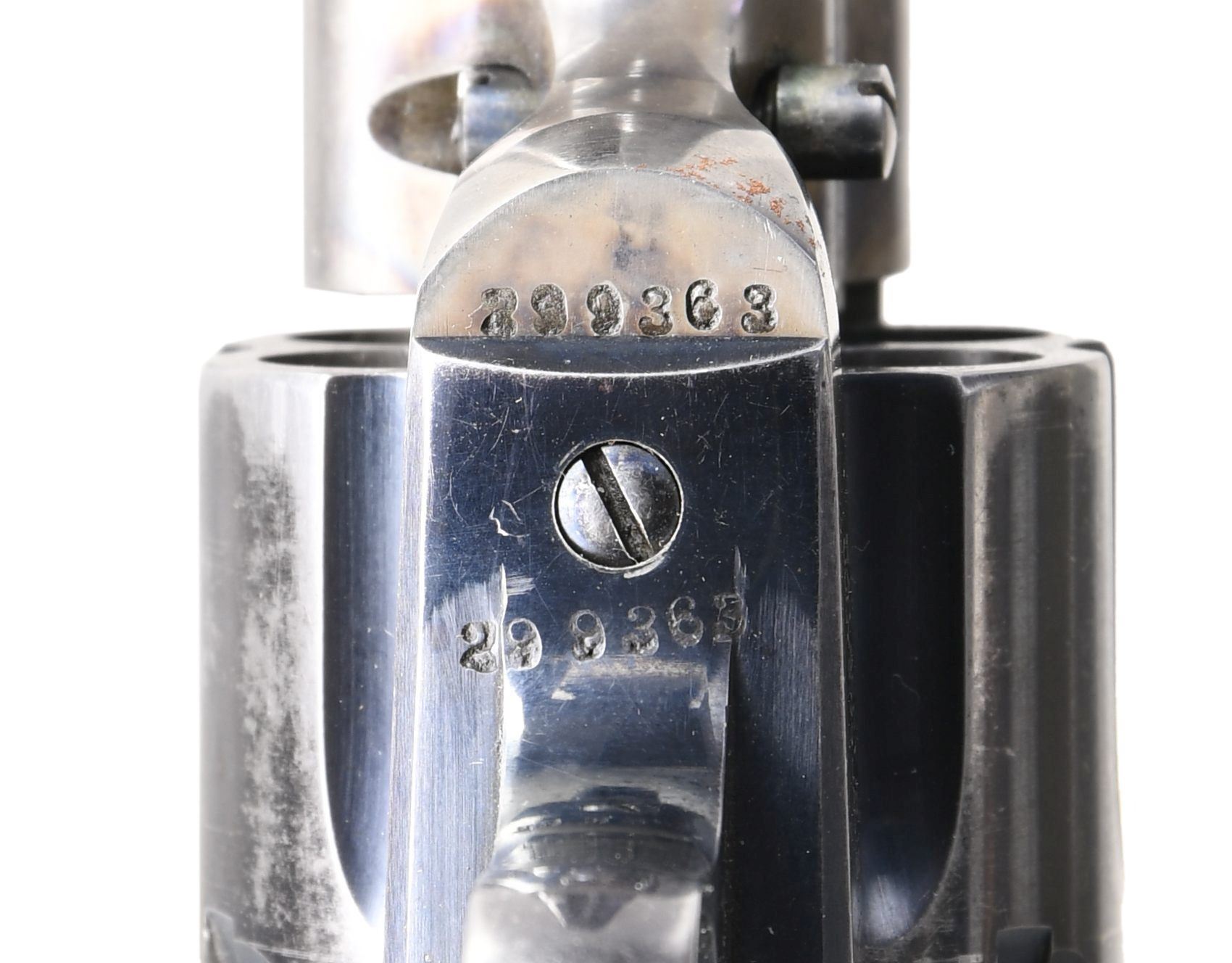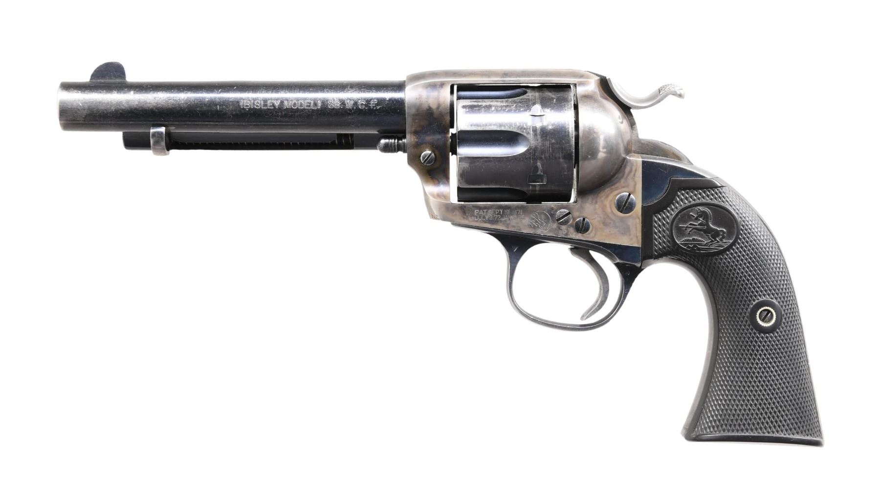 Cal. 38 WCF. S# 299363. Bbl. 5 1/2". Six-shot fluted cyl. Blue and case-colored finish. Two-piece checkered hard rubber rampant colt grips. Frame, trigger guard, and backstrap have matching numbers. Mfg. 1908. CONDITION: bbl., cyl., and grip straps retain 50% of their lightly faded blue. Frame retains 50% of its lightly faded case colors. Good grips. Action shows wear; missing first click. Bore has lightly worn rifling with a bulge 2 3/8" from the muzzle. PROVENANCE: from the lifelong collection of Jerry Senter. (24-822/DS). CURIO. $1,500-2,000.