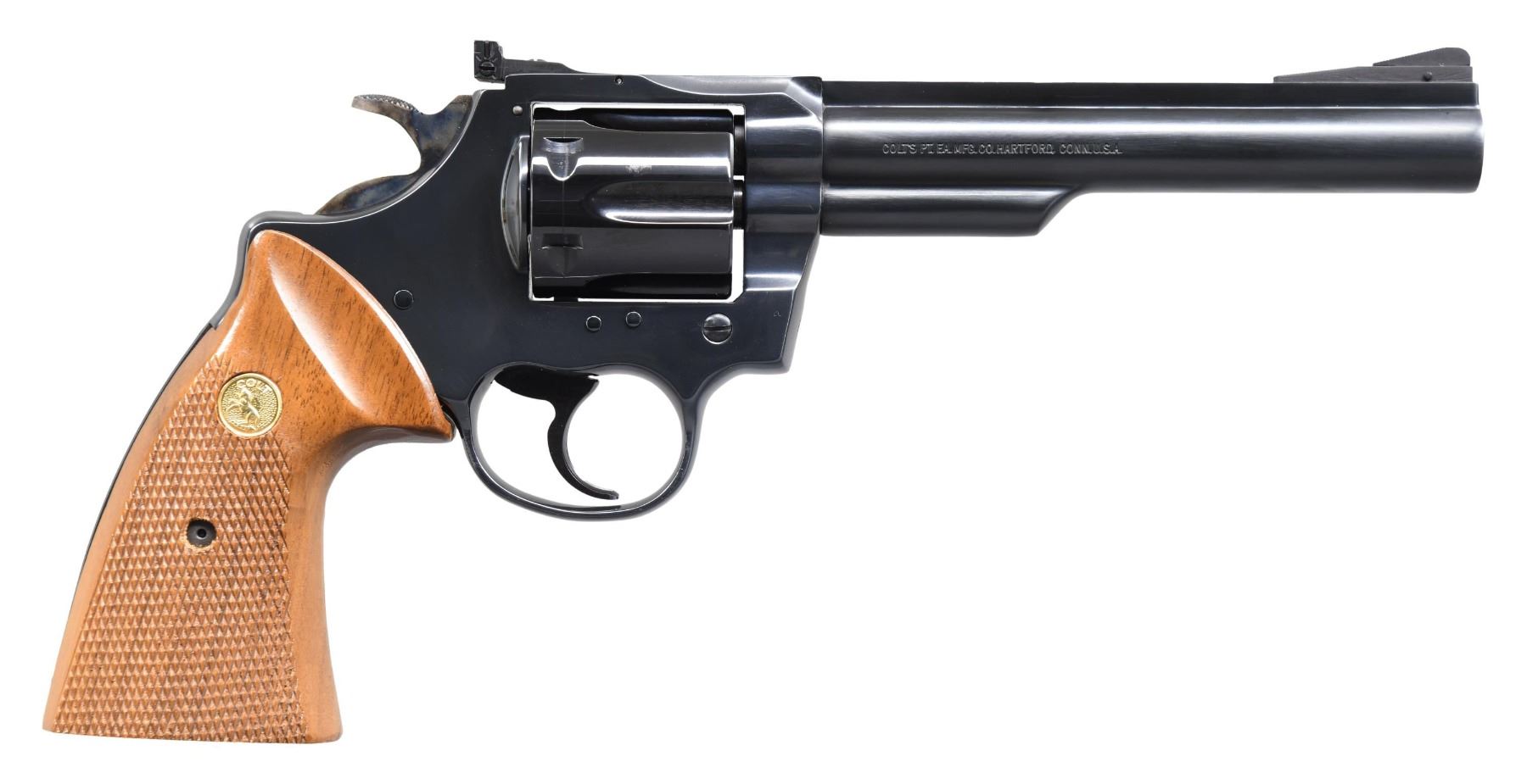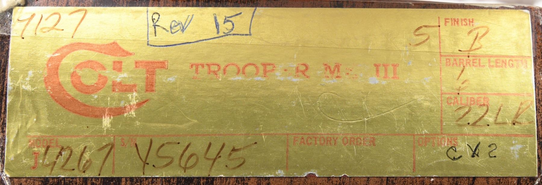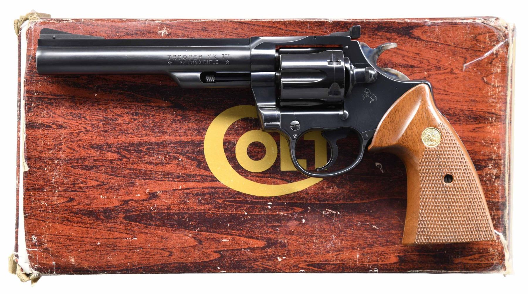 WITH MATCHING FACTORY BOX. Cal. 22 LR. S# Y5645. Bbl. 6". Trooper Mk III double action revolver mfg. by Colt in 1979. Left side of the bbl. is marked with the model and cal. designations, with Colt's single line address marked on the right. Metal components exhibit a blue finish overall, save for on the hammer, which is case color hardened. Frame is mounted with 2-piece Colt gold medallion checkered wood grips. Blade front sight, with adj. square notch rear sight. UNATTACHED ACCESSORIES: matching factory box, containing factory paperwork. CONDITION: fine, with metal components retaining bountiful amounts of their original factory finishes overall. Mirror bore, exhibiting well defined rifling throughout. Grips are excellent. Box exhibits exterior wear, with some tears and taped repairs present overall. (24-6427/MLW). MODERN. $700-1,000.
