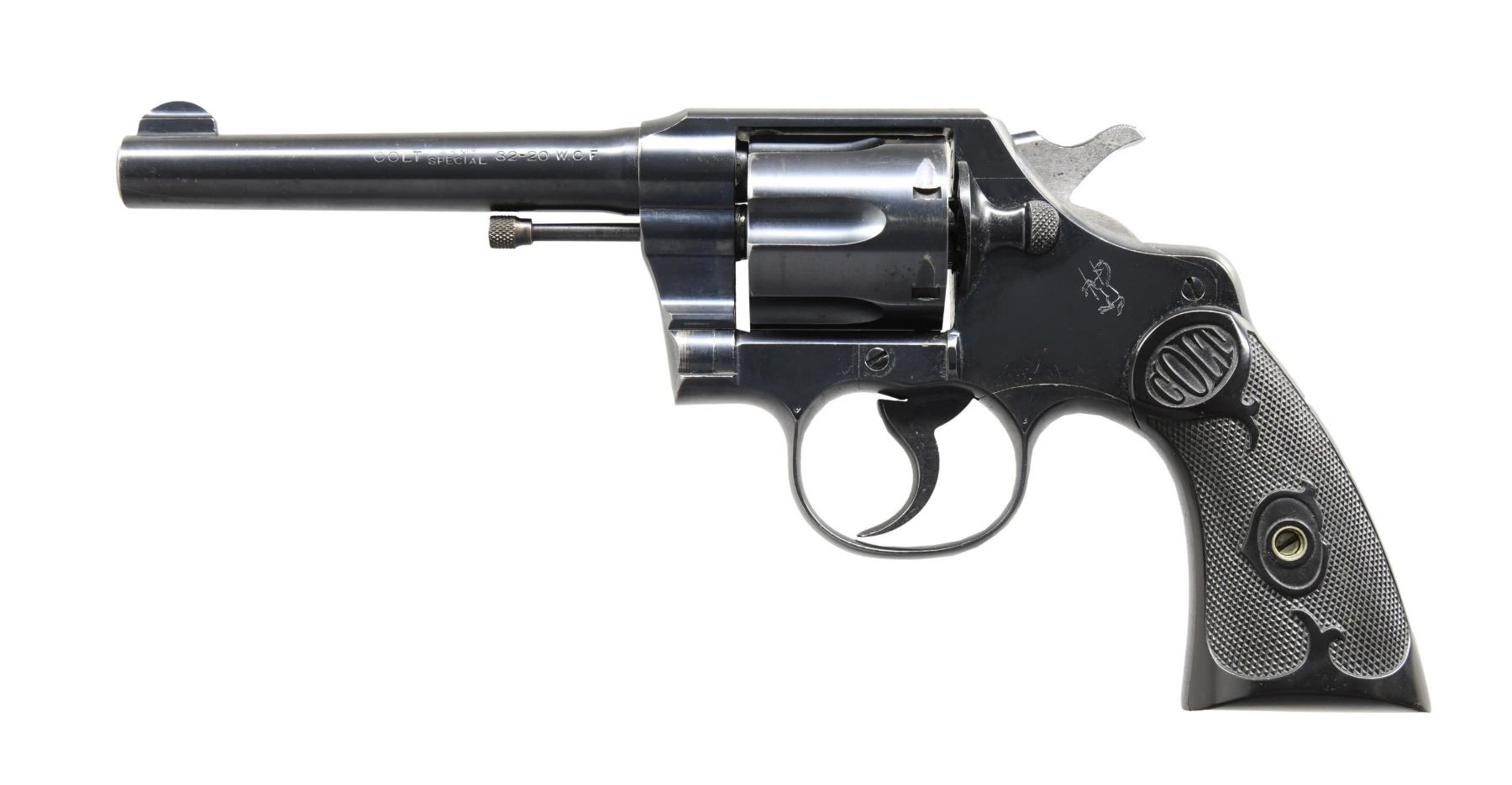 Cal. 32-20. S# 498106. Bbl. 5". Army Special double action revolver mfg. by Colt in 1923. Left side of the bbl. is marked "COLT", followed by "ARMY/ SPECIAL", and the cal. designation, with Colt's mfg. and patent information marked across the top. Left side of the frame is marked with the Rampant Colt logo. Metal components exhibit a blue finish overall. Frame is mounted with 2-piece "COLT" checkered black hard rubber grips. Half-moon blade front sight, with U-notch rear sight. Interior of grip panels are inscribed with the full S#, with the right panel also being inscribed "VERNON". CONDITION: metal components retain the majority of their original factory blue finish, exhibiting a couple of spots of light wear and thinning, a couple of scratches (on the bbl.), as well as a few areas of light surface oxidation overall. Grip straps exhibit light to mild surface oxidation, with the butt exhibiting wear and thinning through to a brown patina. Mirror bore, exhibiting well-defined rifling throughout. Grips show some light smoothing, as well as some superficial marks from handling and storage, but otherwise remain sturdy and serviceable. (24-5661/MLW). CURIO. $700-1,000.