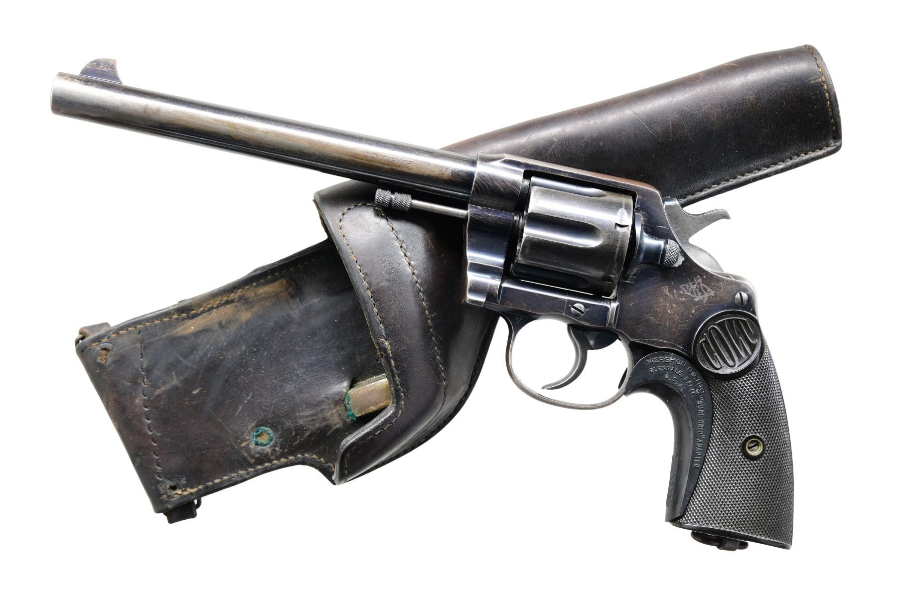 FACTORY LETTER & HOLSTER. Cal. 44 Russian. S# 21823. Bbl. 7 1/2". New Service double-action revolver mfg. by Colt in 1909. The top of the bbl. is marked with Colt's mfg. and patent information, with "NEW SERVICE CAL. 44" marked on the left towards the breech. Left side of the frame is marked with the Rampant Colt in front of a stylized "C." Major metal components exhibit a blue finish, with some smaller components, including the rear strap of the hammer and the trigger, exhibiting a nitre blue finish. Frame is mounted with 2-piece "COLT" checkered black hard rubber grips. Front grip strap is fitted with a Mershon Co. Sure Grip adapter. Clip-point blade front sight with frame U-notched rear sight. Matching numbers are present on the frame and cyl. crane. Grips appear to be a factory error, being hand-scribed "21823" on the interior of the panels. UNATTACHED ACCESSORIES: Audley brown leather holster and factory letter that lists the caliber as "44/c" and indicates that this example was sent in a shipment of five other New Service revolvers to Charles J. Godfrey in New York, NY, on April 30th of 1909. CONDITION: metal components retain large amounts of their original factory blue finish, exhibiting areas of wear and thinning overall that show through to gray and brown patinas, areas of light to mild surface oxidation, as well as some striations from former cleaning. Very bright bore, exhibiting some pitting and light oxidation (primarily towards the muzzle), while retaining well-defined rifling throughout. Grips exhibit a few scattered marks from handling and storage, as well as some smoothing, with the right grip exhibiting a chip towards the bottom right corner of the panel. Leather holster remains malleable, exhibiting some wear, while remaining sturdy and serviceable overall. (24-3804/MLW). MODERN. $400-600.