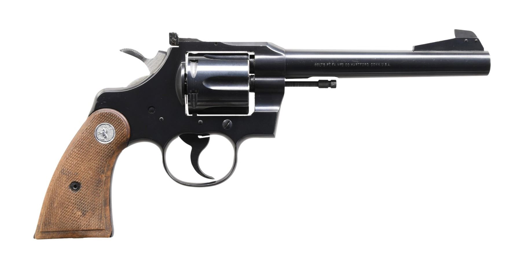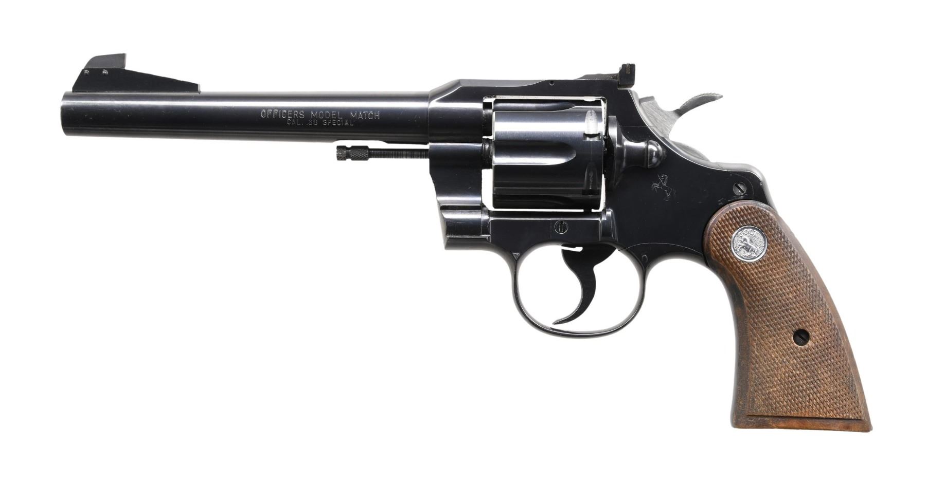 Cal. 38 Spl. S# 937633. Bbl. 6". Officers Model Match double action revolver mfg. by Colt during the mid-1960s. Left side of the bbl. is marked with the model and cal. designations, with Colt's single line address marked on the right. Left side of the frame is marked with the Rampant Colt logo. Metal components exhibit a professionally reapplied blue finish. Frame is mounted with 2-piece Colt silver medallion checkered wood grips. Ramped target front sight with adj. square notch rear sight. CONDITION: metal components retain the vast majority of their reapplied blue finish, exhibiting scattered superficial handling marks as well as a few small spots of wear. Mirror bore, exhibiting well-defined rifling throughout. Action functions appropriately when cycled by hand. Grips exhibit smoothing, as well as scattered marks and impressions from handling and storage, but otherwise remain sturdy and serviceable. (24-3866/MLW). CURIO. $450-650.