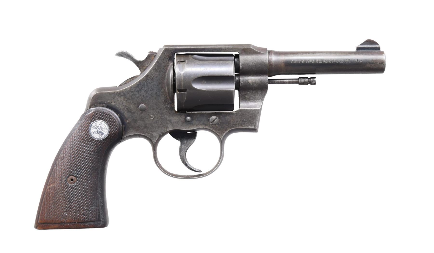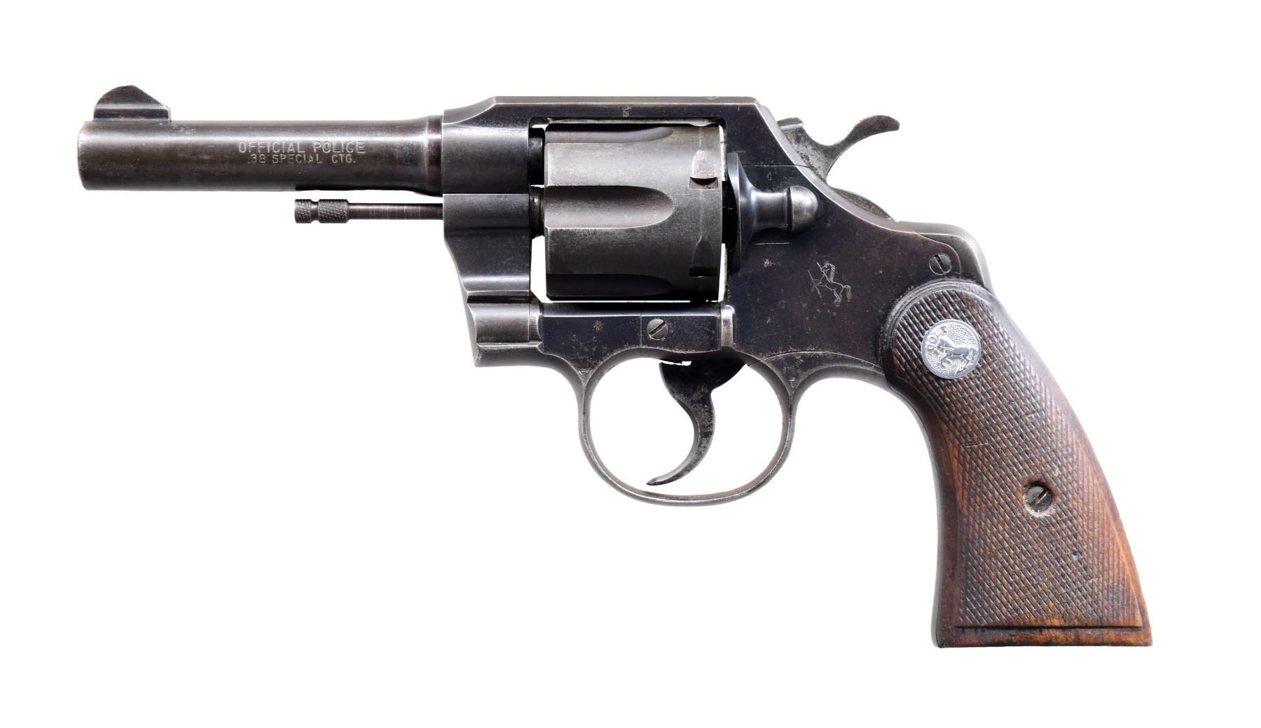 Cal. 38 Spl. S# 829157. Bbl. 4". Official Police double action revolver mfg. by Colt in 1953. Left side of the bbl. is marked with the model and cal. designations, with Colt's single line address marked on the right. Left side of the frame is marked with the Rampant Colt logo. Metal components exhibit a blue finish overall. Frame is mounted with 2-piece Colt silver medallion checkered wood grips. Blade front sight, with frame notched rear sight. CONDITION: metal components retain poor amounts of their original factory blue finish, with the balance exhibiting wear and thinning that shows through to gray and brown patinas, as well as varying degrees of surface oxidation and pitting overall. Very bright bore, exhibiting what appears to be some scattered spots of hardened grease while retaining well-defined rifling throughout. Grips show smoothing, as well as scattered marks and minor impressions from handling and storage, but otherwise remain sturdy and serviceable. (24-5480/MLW). CURIO. $300-400.
