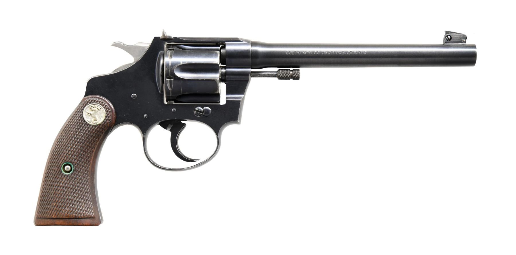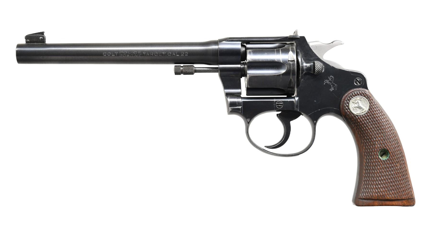 REVOLVER. Cal. 22 LR. S# 30641. Bbl. 6". Police Positive .22 Target double action revolver mfg. by Colt in 1925. Left side of the bbl. is marked "COLT", followed by "POLICE/ POSITIVE", "TARGET" and "CAL.22", with "COLT's MFG CO HARTFORD, CT. U.S.A." marked on the right. Left side of the frame is marked with the Rampant Colt logo. Metal components exhibit a blue finish overall. Hammer has been cleaned and polished. Frame is mounted with 2-piece Colt silver medallion checkered wood grips. Patridge front sight, with adj. square notch rear sight. Bbl. appears to be a later production replacement. CONDITION: metal components retain the majority of their original factory finishes, exhibiting some scattered spots of light wear and thinning, scattered handling marks, as well as a few small spots of light surface oxidation overall. Mirror bore, exhibiting well-defined rifling throughout. Grips show some light to mild smoothing, as well as some scattered marks and minor impressions from handling and storage, but otherwise remain sturdy and serviceable. (24-5656/MLW). CURIO. $500-700.
