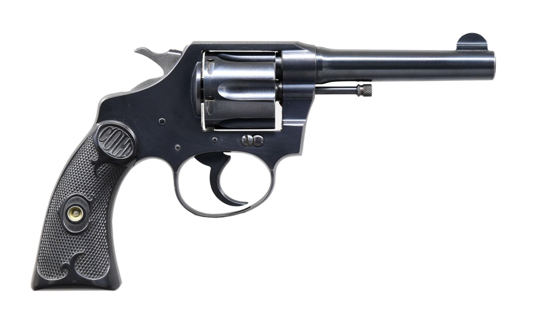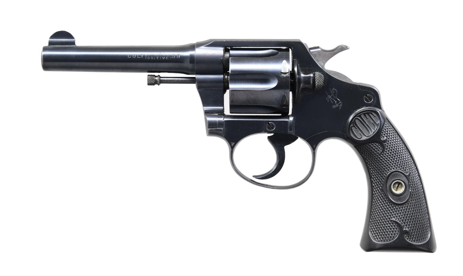 REVOLVER. Cal. 38 Colt. S# 153789. Bbl. 4". Police Positive .38 double action revolver mfg. by Colt in 1924. Left side of the bbl. is marked "COLT", followed by "POLICE/ POSITIVE" and ".38", with Colt's mfg. and patent information marked over the top. Left side of the frame is marked with the Rampant Colt logo. Metal components exhibit a blue finish overall. Frame is mounted with 2-piece "COLT" checkered black hard rubber grips. Half-moon blade front sight, with square frame notched rear sight. Grips are matching via the full S#, which is inscribed on the interior of the panels. CONDITION: metal components retain the vast majority of their original factory blue finish, exhibiting light edge wear, with some light thinning present on the grip straps. Mirror bore, exhibiting well-defined rifling throughout. Grips show a few light superficial marks from handling and storage but otherwise remain very good overall. (24-5651/MLW). CURIO. $400-600.