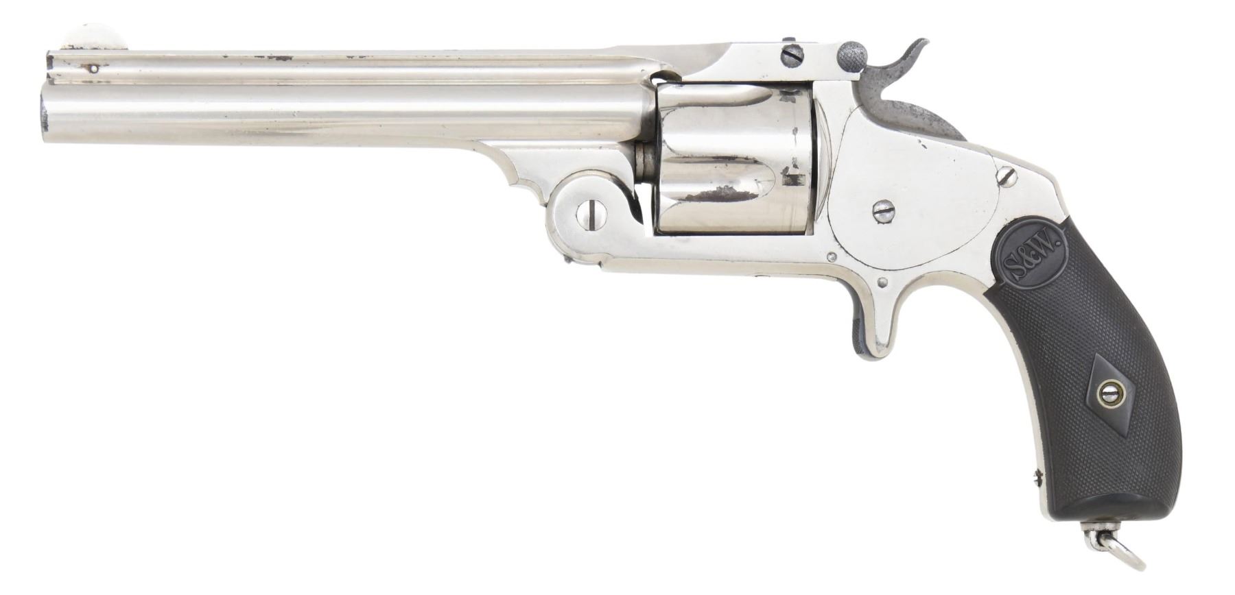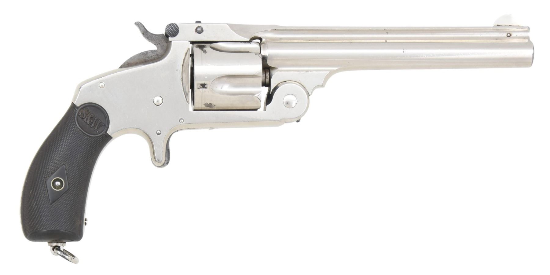 ACTION TOP BREAK REVOLVER. Cal. 38 S&W. S# 31144. Bbl. 5". Scarce 2nd Model single action revolver with 5" bbl. mfg. by Smith & Wesson, circa. 1877-1891. The top of the solid bbl. rib is marked with Smith & Wesson's mfg. and patent information between 2 Maltese crosses. Frame, cyl., and bbl. exhibit a nickel plated finish. Case color hardened hammer, with blued bbl. latch and trigger. Frame is mounted with 2-piece brown "S&W." diamond checkered brown hard rubber grips. Half-moon blade front sight, with notch rear sight. Matching numbers are present on the frame (beneath left grip panel), cyl., as well as the bbl. "3445" is handwritten on the interior of the right grip panel. S# on butt has been obscured by a lanyard loop. Bbl. latch is an unnumbered period replacement. CONDITION: frame, cyl., and bbl. retain the majority of their original factory nickel plated finish, exhibiting some flaking on the bbl. and bbl. rib, with scattered superficial handling marks present overall. Cyl. exhibits areas of flaking, with the front face retaining little of its nickel plating, and the rear face retaining good amounts of its nickel plating. Hammer retains traces of its original case color hardening, with the balance exhibiting a gray patina and scattered spots of age related discoloration. Very bright bore, exhibiting light to mild degrees of pitting, while retaining well defined rifling throughout. Grips show some mild smoothing, as well as some scattered superficial marks from handling and storage, but otherwise remain very good overall. PROVENANCE: From the Collection of a Tennessee Gentleman. (01-25696/BH). ANTIQUE. $900-1400.