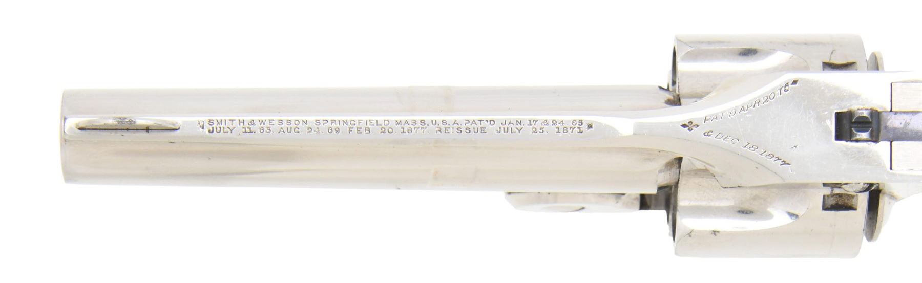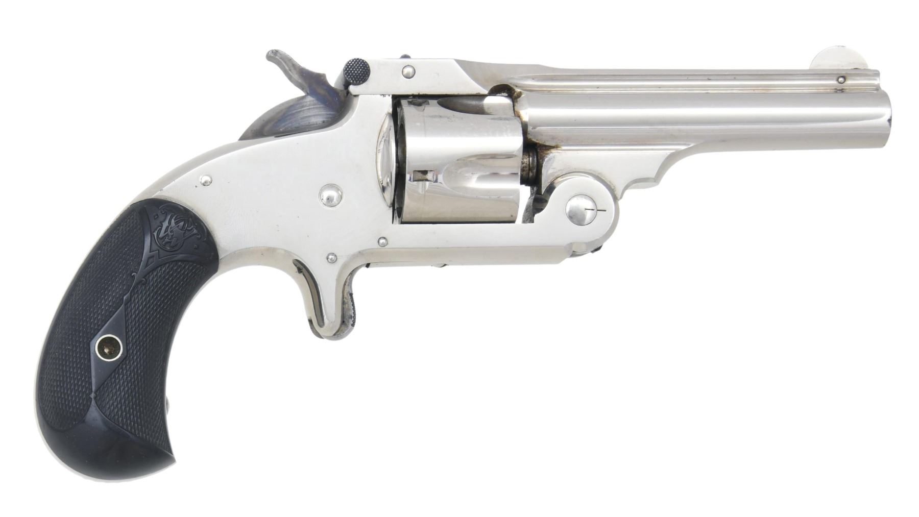 CENTERFIRE SINGLE ACTION REVOLVER. Cal. 32 S&W. S# 90555. Bbl. 3". Model 1 1/2 Centerfire single action top break revolver mfg. by Smith & Wesson. The top of the solid bbl. rib is marked with Smith & Wesson's mfg. and patent information, with the top strap marked "PAT'D APR.20.76" above "& DEC 18.1877." Frame, cyl., and slide exhibit a lustrous high polish nickel-plated finish, with the trigger and hammer exhibiting a case-color hardened finish. Bbl. latch is blued. Frame is mounted with 2-piece S&W monogram checkered black hard rubber grips. Half-moon blade front sight, with U-notch rear sight. All serialized parts are matching and include the frame, cyl., bbl., and bbl. latch. Right grip is inscribed with the full S# on the interior of the panel. CONDITION: Nickel-plated components retain bountiful amounts of their original factory finish, exhibiting some superficial handling marks as well as some small scattered spots of flaking overall. Hammer retains fair to good amounts of their original case color hardened finish, with the trigger retaining a mostly gray patina. Very bright bore, exhibiting some spots of light pitting while retaining well-defined rifling throughout. Grips show some superficial marks from handling and storage but otherwise remain very good overall. A high-condition and extremely attractive example of a Smith & Wesson Model 1 1/2 Centerfire revolver. PROVENANCE: from the collection of a Tennessee gentleman. (01-25712/MLW). ANTIQUE. $800-1,000.