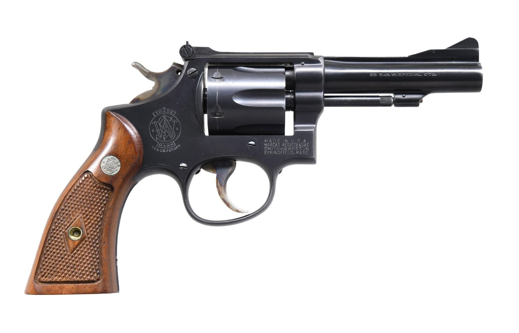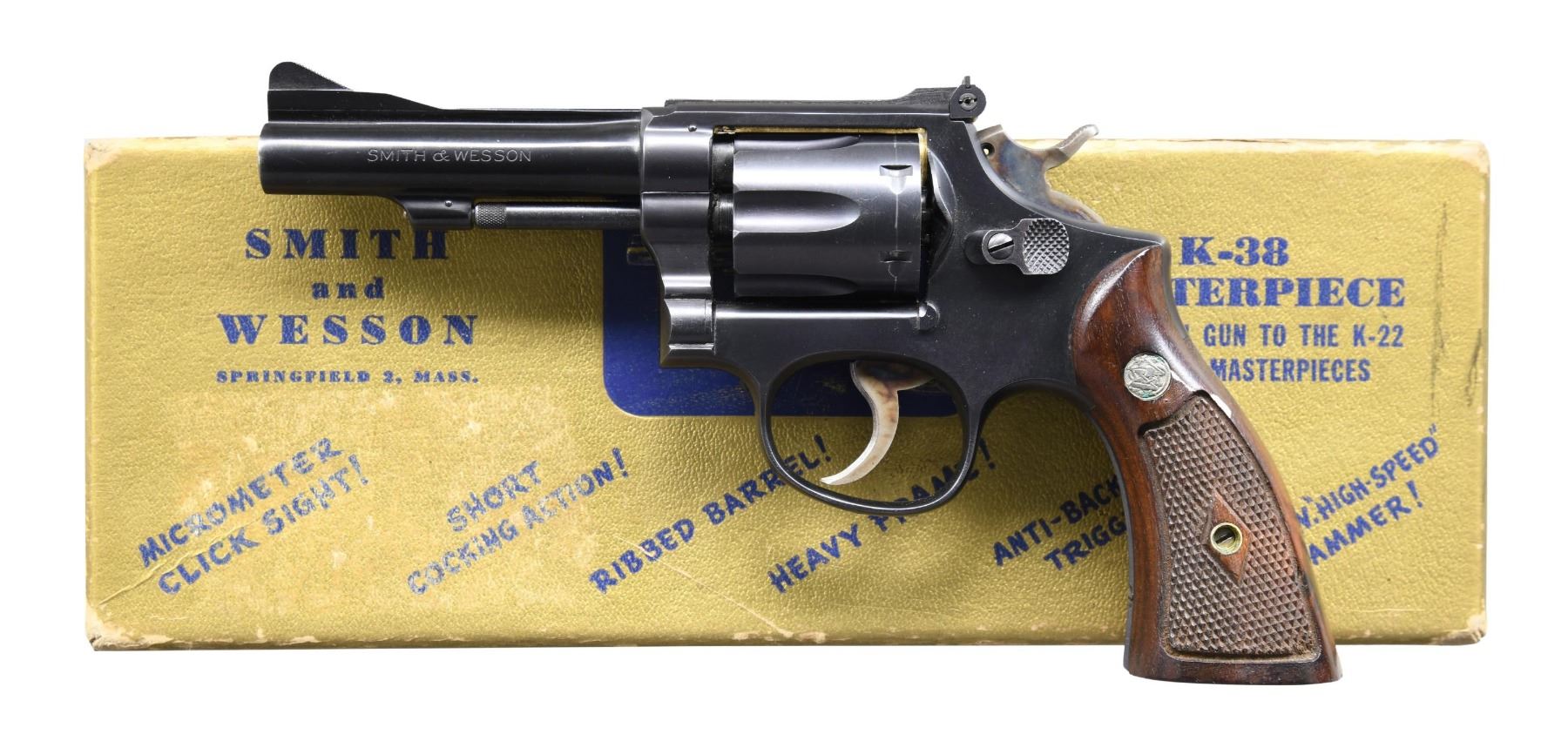 Cal. 38 Spl. S# K103905. Bbl. 4", pinned. Ramped, serrated blade front sight. Adjustable square notch rear sight. Matching numbers on frame, bbl., cyl., extractor, and right grip panel. Mfg. 1950. Blued finish with case-colored trigger and hammer. Checkered walnut grips with silver S&W medallions. UNATTACHED ACCESSORIES: gold factory box for a 6" K38 Combat Masterpiece with manual, screwdriver, and cleaning kit. CONDITION: grips show a couple light handling marks. Trigger and hammer retain most of their case colors with light operational wear. Balance of metal retains 98% original blue with a light turn line on cyl. and some minor edge wear. Action functions properly when hand-cycled. Bright, near excellent bore. (24-5617/MJC). CURIO. $700-1,000.