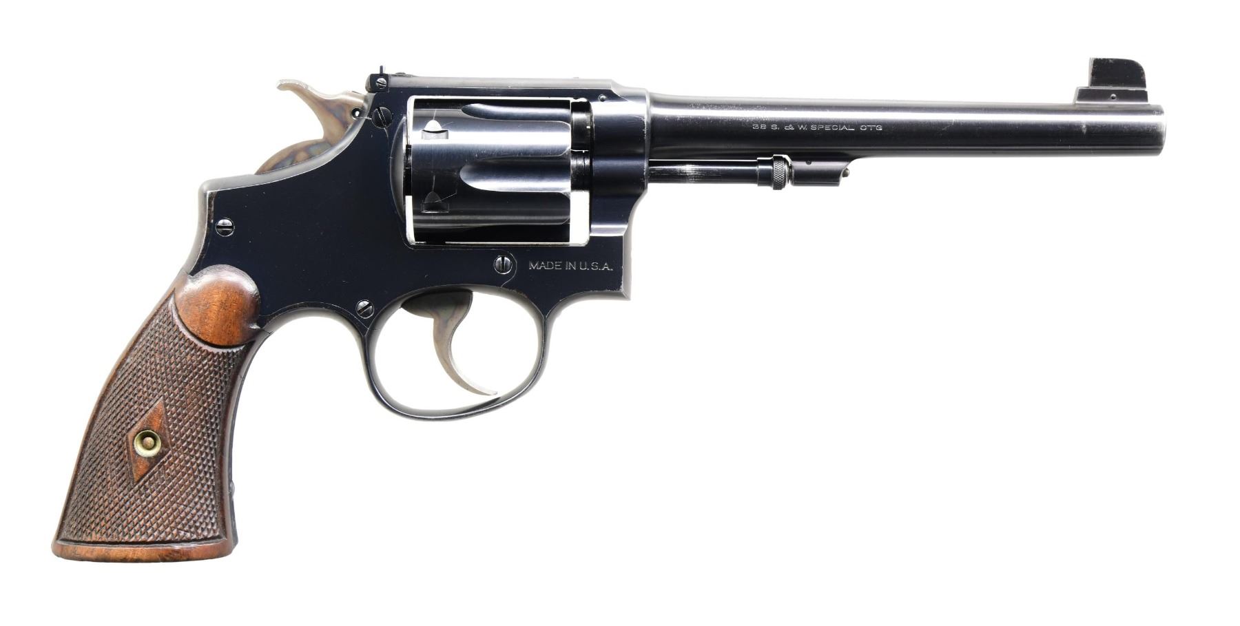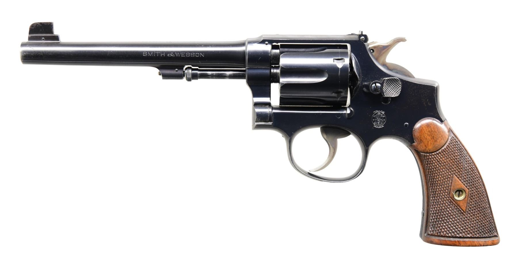 Cal. 38 Spl. S# 510713. Bbl. 6" with pinned Patridge blade front sight plus adjustible, frame-contoured rear sight. Scarce 4th Variation Target model manufactured 1915-1942 having serrated grip straps (initiated 1923). Square butt configured (standard models were round butts) having correct diamond center checkered walnut grips without medallions (no serial numbers on backs). Two-line S&W barrel address with patent dates on top plus "SMITH & WESSON" on the left side and caliber designation on the right side. S&W logo on left side of frame below cylinder release plus "MADE IN USA" on lower right front. Case-colored, checkered hammer and serrated-faced trigger (smooth-faced on standard models); both .265" wide. Matching serial numbers on barrel, extractor, and cylinder. CONDITION: very good to excellent appearing with factory quality refinish having muzzle thinning plus sharp edge wear consistent with light use and holstering. Very good grips with light hand wear and slight butt marks to include a small, shallow hole on each. Near excellent bore. Timing slightly off on one chamber. Trigger engagement allows release with forward thumb pressure on hammer; needs trigger replaced or its nose reshaped. PROVENANCE: from the collection of Gun Sport Ltd., owned by Jon R. Thomas. (23-4474/LA). CURIO. $600-900.