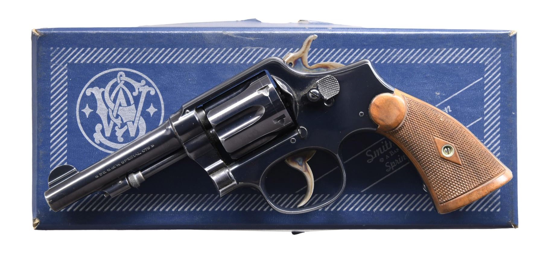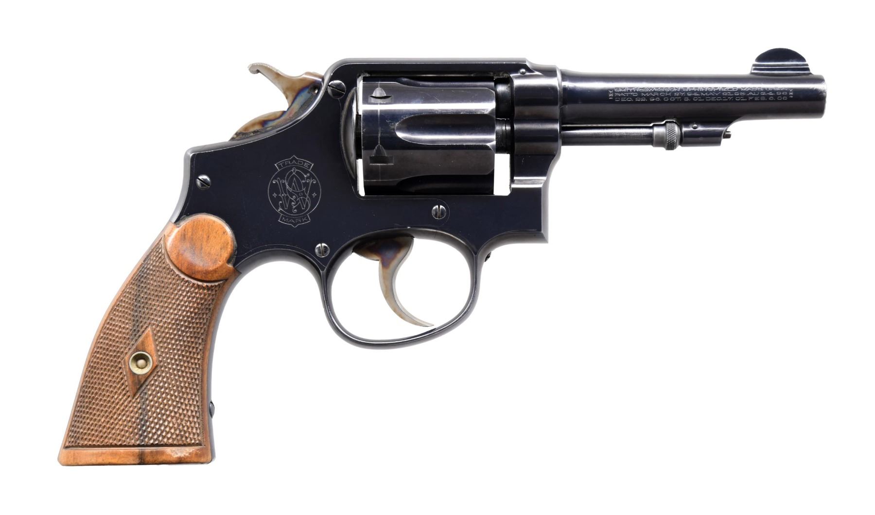 Cal. 38 Spl. S# 131057. Bbl. 4", pinned. Round blade front sight. Fixed rear sight. Matching stamped numbers on frame, bbl., cyl., and extractor. Matching pencil number on inside of right grip panel. Early M&P Hand Ejector that appears to be a first model without pins under the extractor. Right side of bbl. has several patent dates, with the last date of February 6th, 1906. Blued finish with case-colored trigger and hammer. Unmarked checkered hardwood grips. UNATTACHED ACCESSORIES: later replacement S&W 12-2 box with manual and paperwork. CONDITION: grips show a few handling marks. Hammer and trigger retain most of their case colors with some light operational wear. Balance of metal retains 93% original blue with scattered light fading and edge & handling wear. Action functions properly when hand-cycled. Bright, near excellent bore. (24-5623/MJC). CURIO. $400-600.