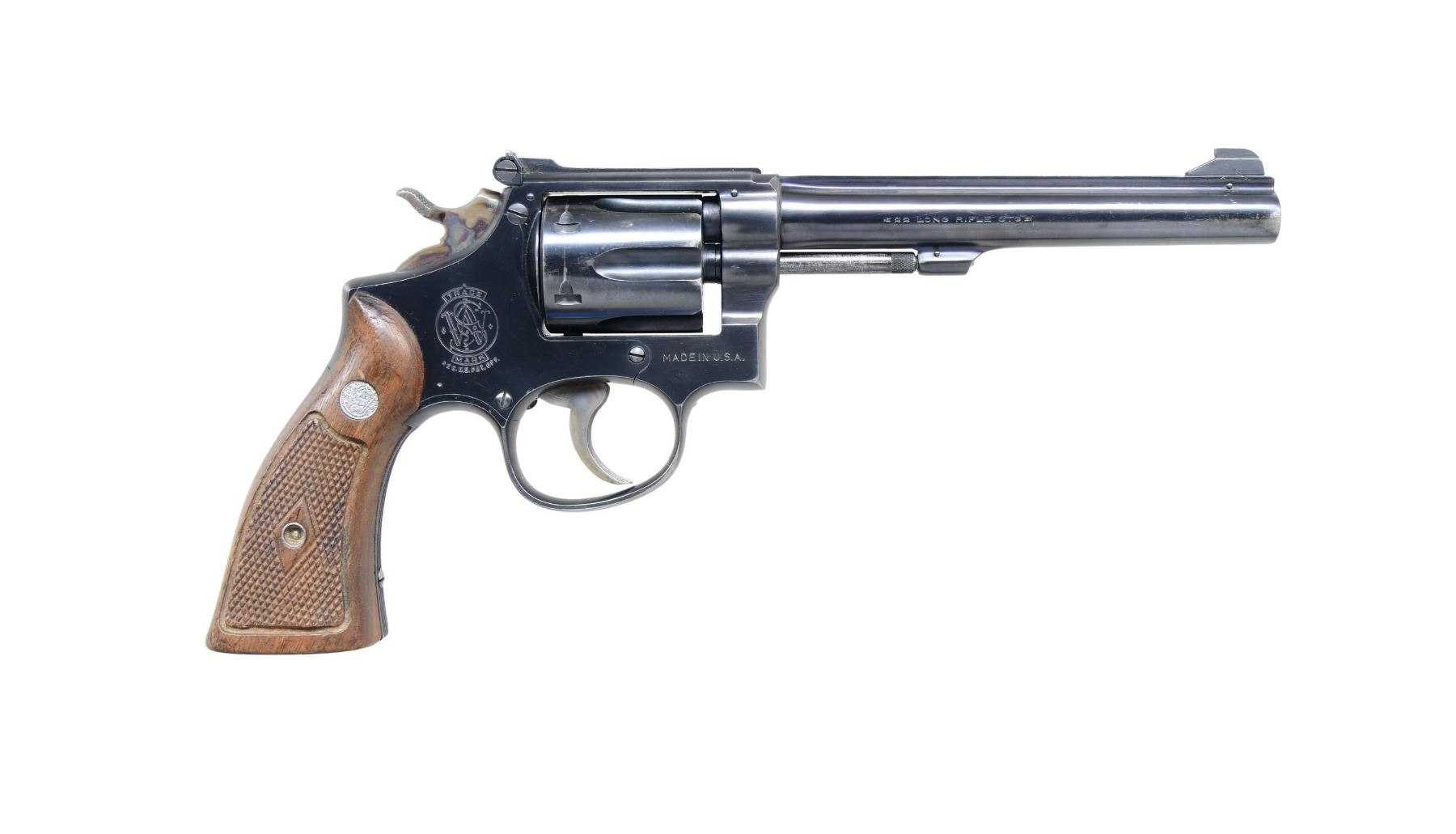 REVOLVER WITH FACTORY BOX. Cal. 22 LR S# K16625 (mfg. 1947). Configuration includes a blued finish, 6-inch barrel, pinned Patridge front sight, and Micrometer adjustable rear sight. The revolver has a standard hammer and trigger with a square butt frame. The matching cylinder holds 6 rounds and is fluted; matching extractor. Grips are checkered walnut with S&W medallions. UNATTACHED ACCESSORIES: Factory box with screwdriver & cleaning rod. CONDITION: Approx. 90% of an old professional blued refinish remaining on the barrel and frame, showing wear, marks & spots of cleaned oxidation. Grips are in fair condition with worn finish and wear to checkering. Bore is bright with strong rifling. (24-4870/MD) CURIO. $800-1,200.