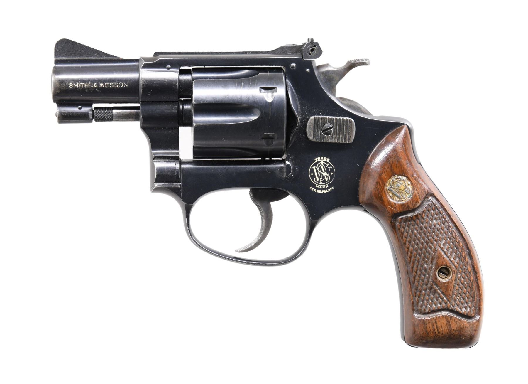 REVOLVER. Cal. 22 LR. S# 9288. Bbl. 2". Ramped, serrated blade front sight. Adjustable square notch rear sight. Matching numbers on frame, bbl., cyl., extractor, and right grip panel. Flat cyl. latch. Blued finish with case-colored trigger and hammer. Backstrap has the inscribed name "ALICE GUNN". Factory markings have added white highlight paint. Checkered walnut grips with silver S&W medallions. CONDITION: grips show a small repair at front of right panel, scattered flaking finish, checkering wear, and handling marks. Trigger and hammer retain strong traces of case colors with overall fading and scattered oxidation. Balance of metal retains 60% original blue with a few light scratches, scattered fading, light oxidation, and edge & handling wear. Action functions properly when hand-cycled. Bright, very good+ bore. (24-5612/MJC). CURIO. $500-750.