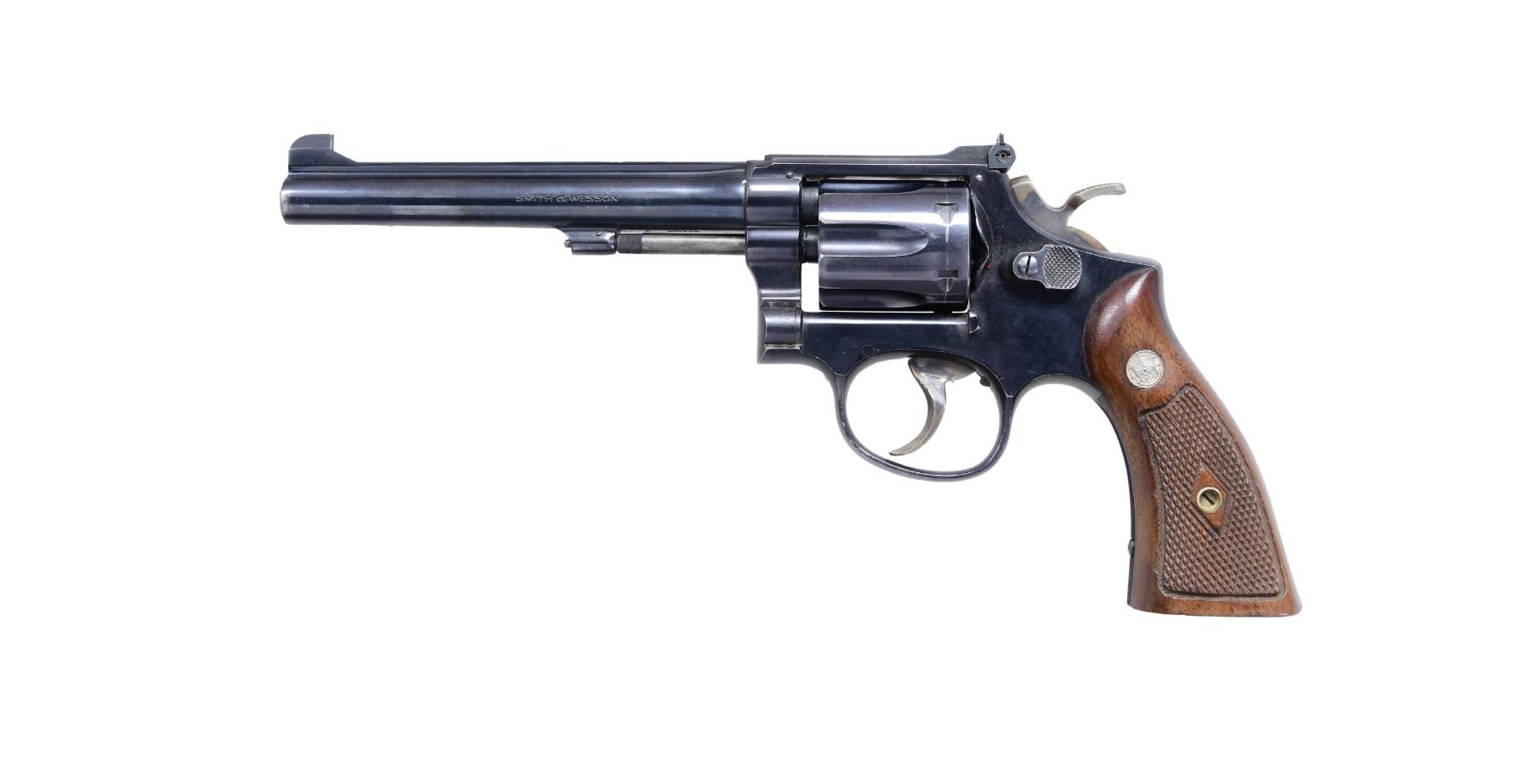 MODEL REVOLVER. Cal. .22 LR. S# K244688 (mfg. 1955). Blued finish with 6-inch barrel. Pinned front sight with adjustable rear sight. Case-hardened target hammer and trigger. 5 Screw K-frame with a matching six-round fluted cylinder. Grips are checkered walnut with Smith & Wesson medallions. CONDITION: Overall good condition with approximately 90% of the original finish remaining on the barrel and frame, with slight wear on the edges and high points. The grips are in ver good condition with minor handling marks and wear on the checkering. Bore is bright with strong rifling. CURIO (24-4409/MD) $500-800.