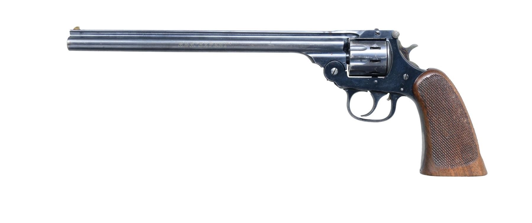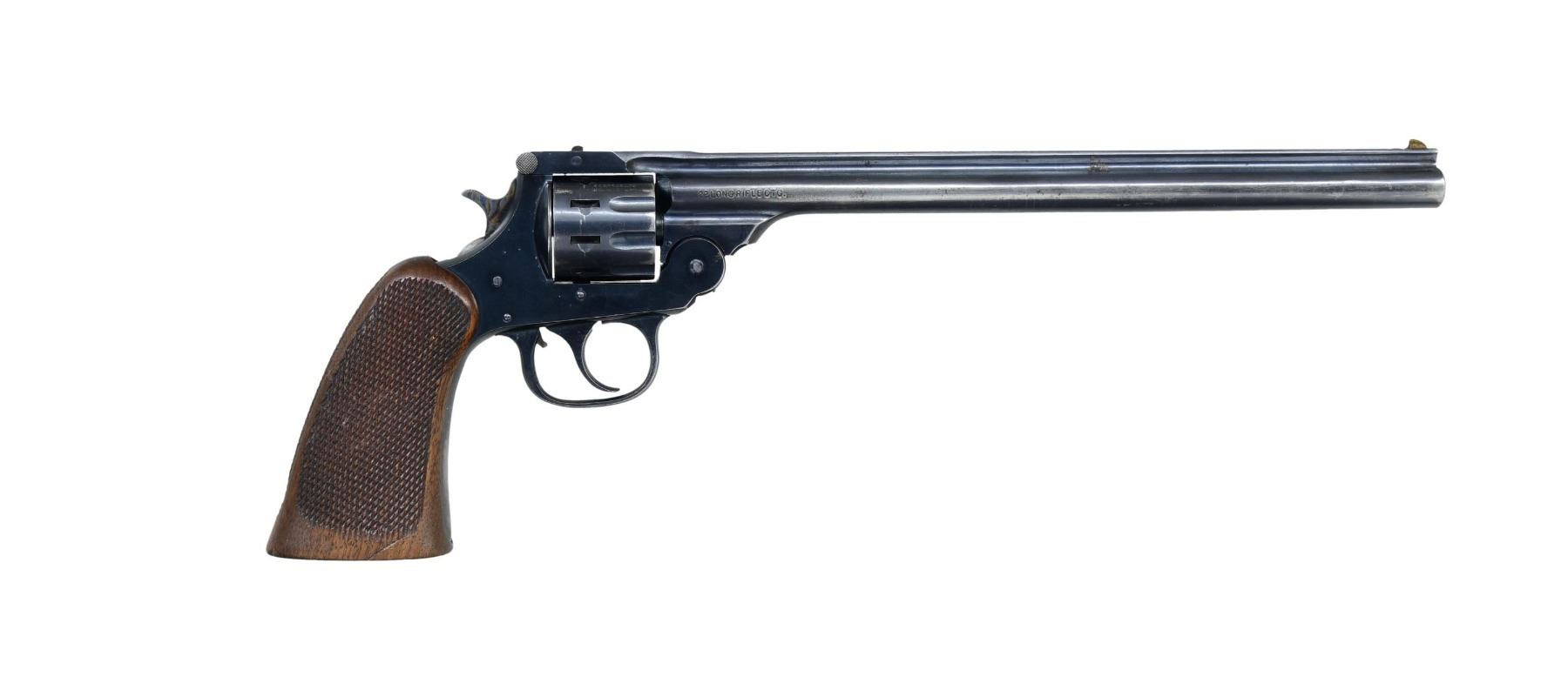 Cal. 22 LR. S# 585551. This revolver features a blued finish with a 10 inch barrel. The front sight is a fixed blade, and the rear sight is an notch. The revolver is fitted oversized with checkered walnut grip. The nine-round cylinder is fluted. CONDITION: The revolver is in good overall condition with approximately 70% of the blued finish remaining on the barrel and frame. The grips show moderate wear with some smoothing of the checkering. The bore is bright with strong rifling. PROVENANCE: From the Collection of a Tennessee Gentleman. (24-4510/MD) CURIO. $150-$225.