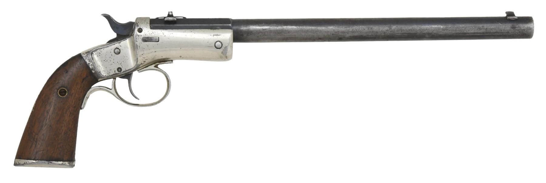 Cal. 22 LR. S# 28249 (mfg. 1896-1916). Bbl. 10", part octaognal-part round, matching-numbered, with blade front sight and a base for rear sight (staff and leaf are missing). Nickel iron frame with firing pin bushing, conventional trigger, and guard, along with a slot for the stock. Two-piece walnut grips. CONDITION: fair barrel blue mixed with a gray/brown patina, showing spots of oxidation throughout. Good nickel finish with scattered spots of peeling and numerous scratches. Good wood finish with deep marks. Fair bore with pitting. (24-6013/MD). CURIO. $200-400.